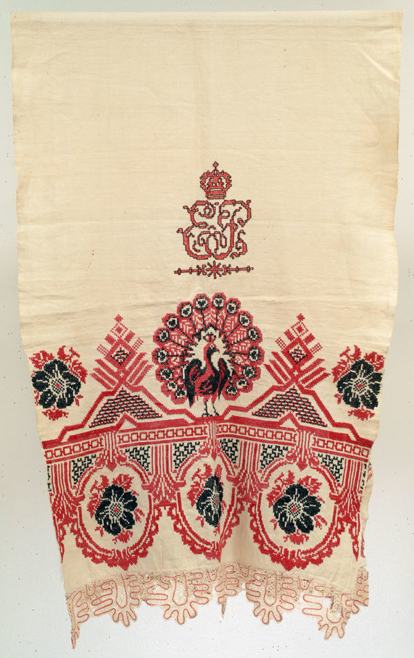 Narrow shawl or runner of home spun linen embroidered with silk in an assortment of motifs; including a peacock, flowers and the initials EP below a crown; the edges are finished with delicate lacing; all done in reds and blues.