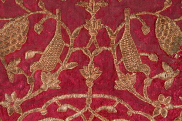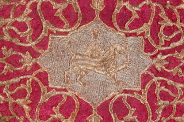 This embroidered velvet cover was made in Persia in the 19th century. The velvet is embroidered with metallic thread. The center medallion features a lion with the sun rising behind him, which was the emblem of the Qajar dynasty which ruled Persia from 1794 through 1925. It is surrounded with a field of meandering vines with flowers and birds, with a similarly decorated triple border.