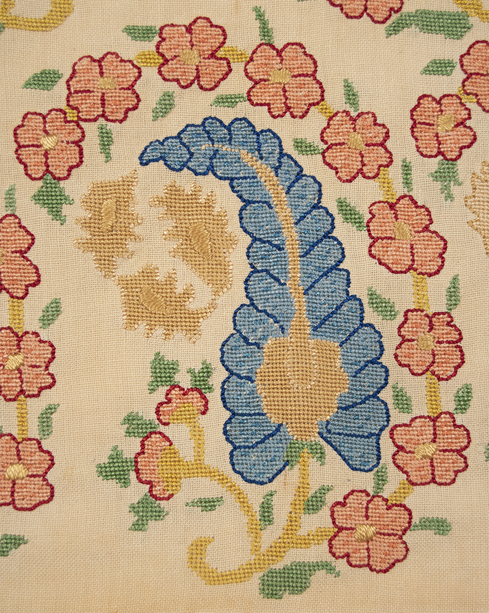 These two embroidery fragments likely came from the same ritual towel. Worked on silk with polychrome silk in counted stitch technique. The design features botehs surrounded with botanical motifs.