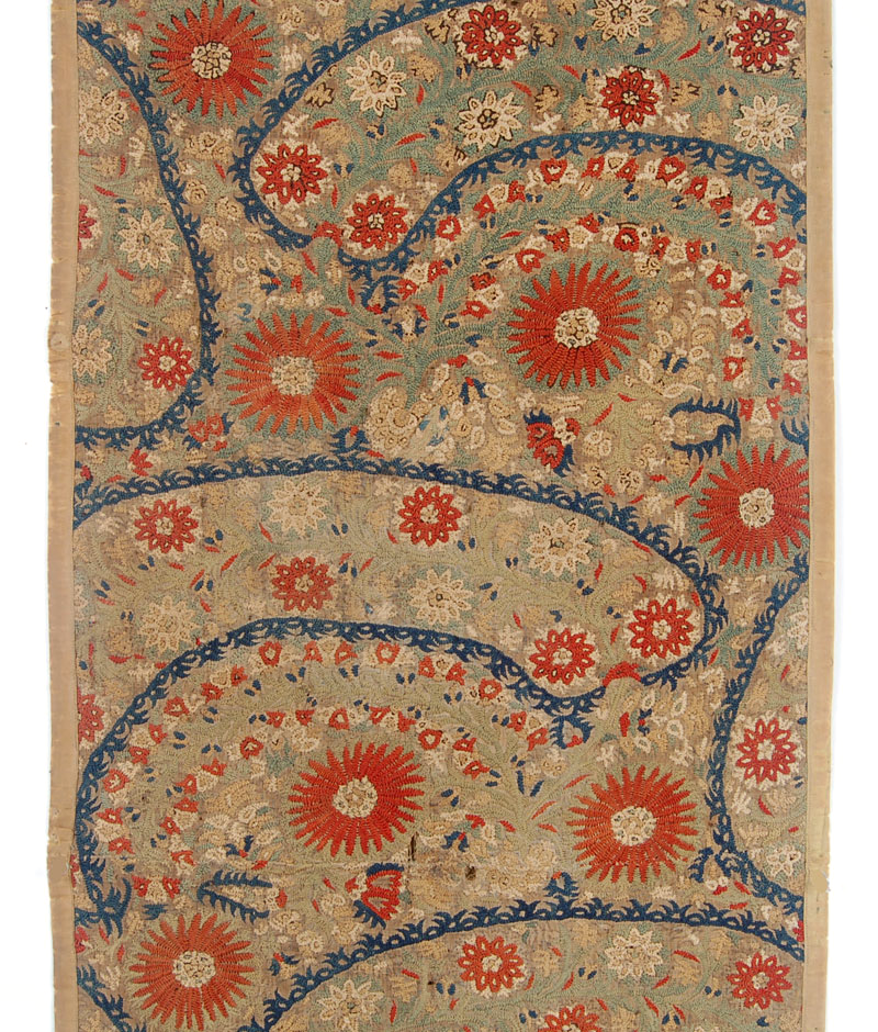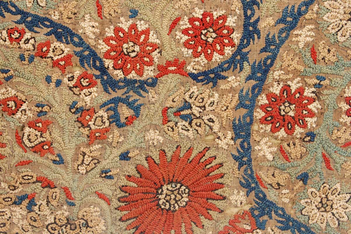 Embroidered linen fragment worked in silk in shades of blue, russet, green and ivory in herringbone stitch with crescent shaped leafy fronds containing round russet and ivory round flowers with more flowers filling up the rest of the field. The Epirus region, which is on mainland Greece, stayed the longest under Ottoman rule and as such reflects a strong Ottoman influence in its style. The herringbone stitch though is unique to the Epirus region.