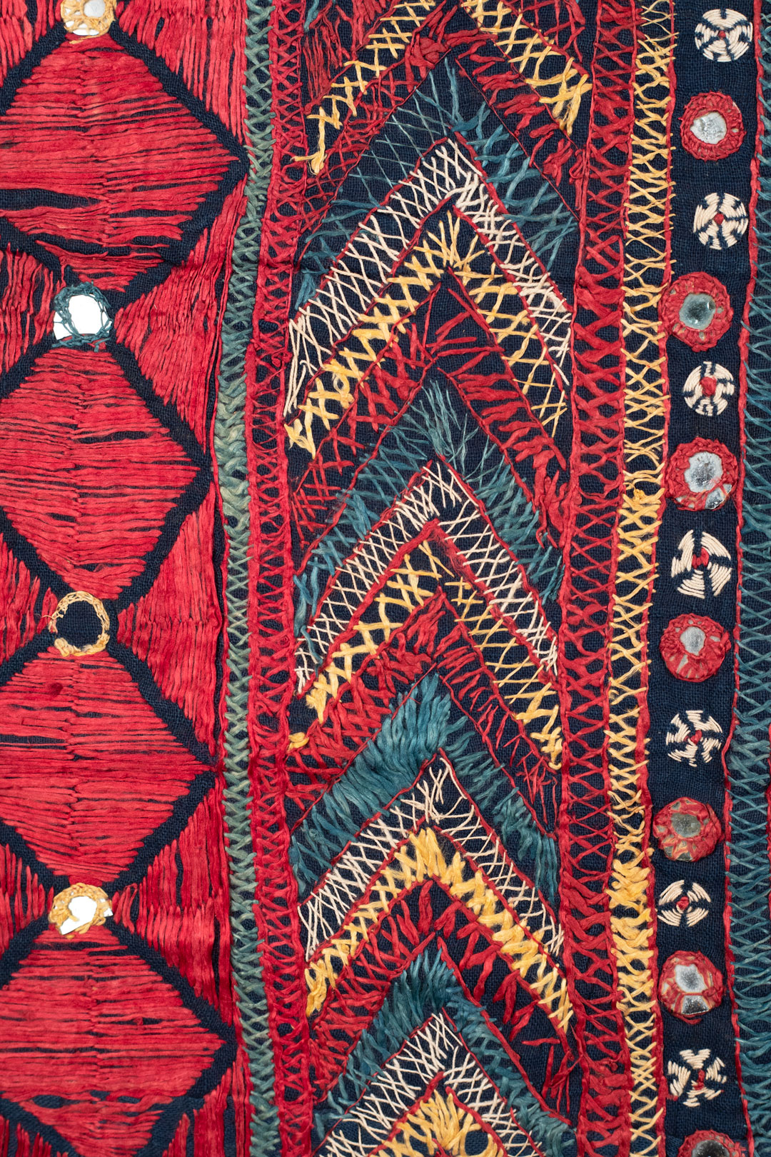 “Chalka” translates to “reflection of light,” and the mirrors on this festival hanging would have done just that. Like many textiles in rural India, they were embroidered by the women to show their creative skills and decorate their home. This piece is embroidered using polychromatic silk floss thread on a cotton ground. The maker used mostly satin stitches and Shisha embroidery to secure the mirrors.