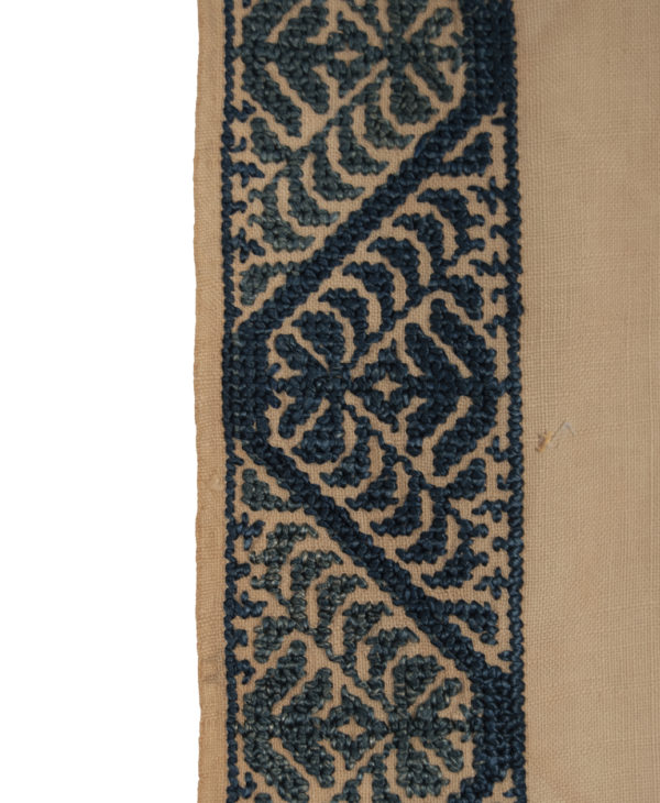 This blue embroidery was made in Fez, Morocco in the 19th century. It is made of cotton and silk.