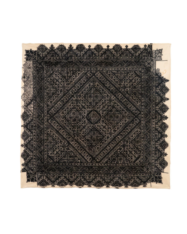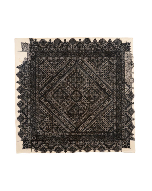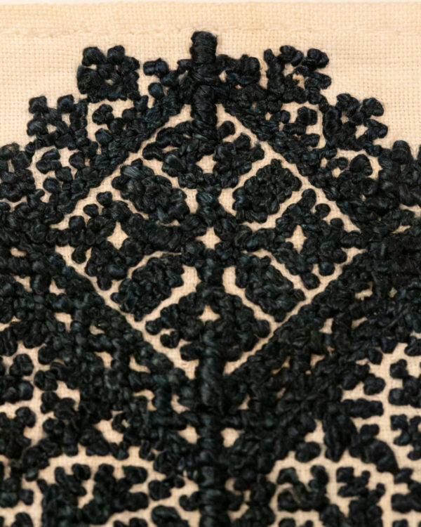 The design and style of Fez embroidery, like many other Moroccan embroideries, show Hispano-Moresque influence. The design elements are abstracted florals and geometrics. It is almost always monochromatic and often reversible. The handwork is executed in a counted stitch technique such as reversible double running stitch, stem stitch or back stitch. The embroidery is done with tightly coiled silk on heavy cotton as in this textile.
