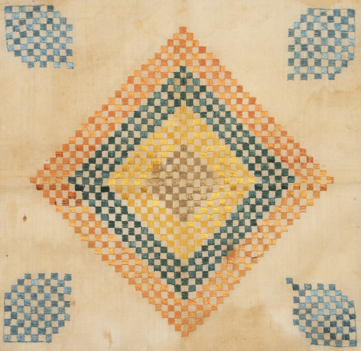 The colors are separated in a checker design with the cotton base being the accent color. In the center, there is a diamond shape in light brown with yellow, green, and orange diamond shaped borders. Beyond this, there is a three inch border that has yellow, grey, orange and green embroidery in slanted lines. This border is outlined in blue and the inner corners are squares that contain grey and light brown silks. The borders continues to the edge of the piece where you see four elongated diamonds in yellow and blue that mirror each other making the entire piece symmetrical.