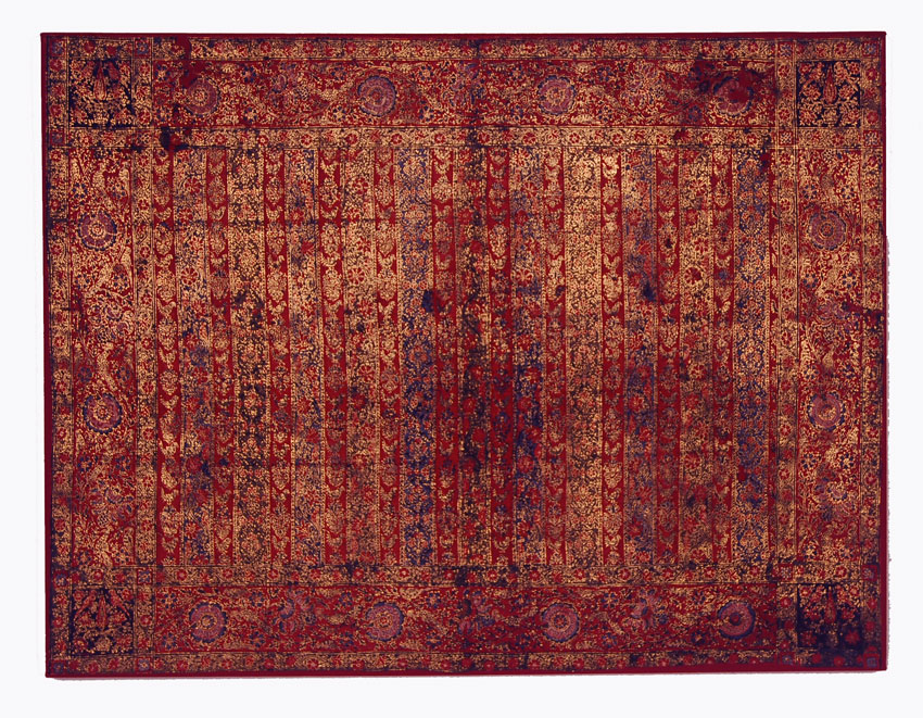 Rectangular cover of red cotton decorated in block printing technique and freehand painting. The design features vertical stripes of red, blue and green filled with a variety of flowers and birds; parrots, peacocks and roosters among them.The triple borders with a primary wide border containing larger, more articulated flowers and birds while the narrow secondary ones containing small flowers. Mounted on a frame. Originally produced on the Coromandel coast and possibly for the Persian market.