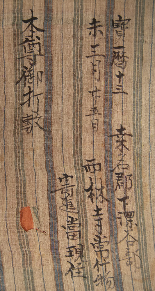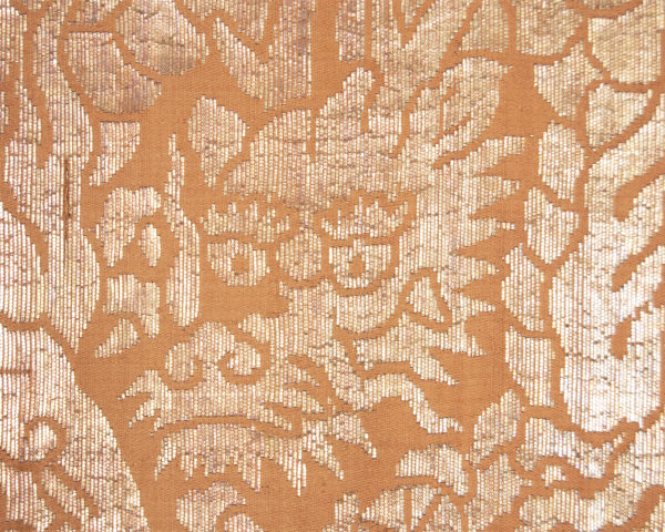 Kinran is a brocading technique that uses paper based silver or gold foil instead of metallic threads or metallic ribbons. Simple enough yet producing shiny and dramatic results,this type of brocading developed in China during the Song dynasty and imported to Japan in the 16th century. It is in Japan where kinran weaving flourished and resulted in opulent textiles used in garments and temple hangings.