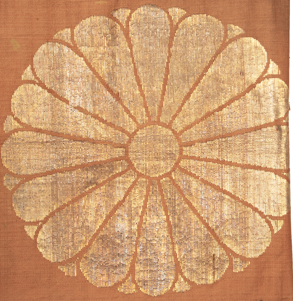 This rather early example has a large repeat of chrysanthemums and dragon motifs in gold against a brown cinnamon ground.