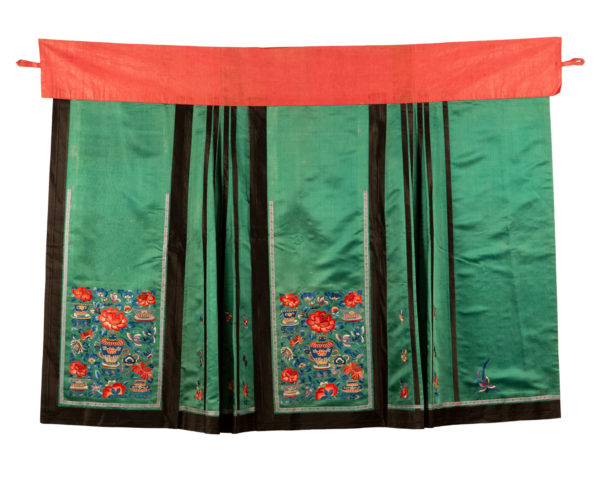 A skirt made out of green silk satin and embroidered on the front and back panels with polychrome flowers and decorated vases. All of the embroidery is executed in stain stitch and forbidden stitch. The narrow panels are similarly decorated with flowers and butterflies, all within an embroidered border in three shades of satin stitched blue with floral design. The waistband is a red cotton, and the skirt is lined with blue silk.