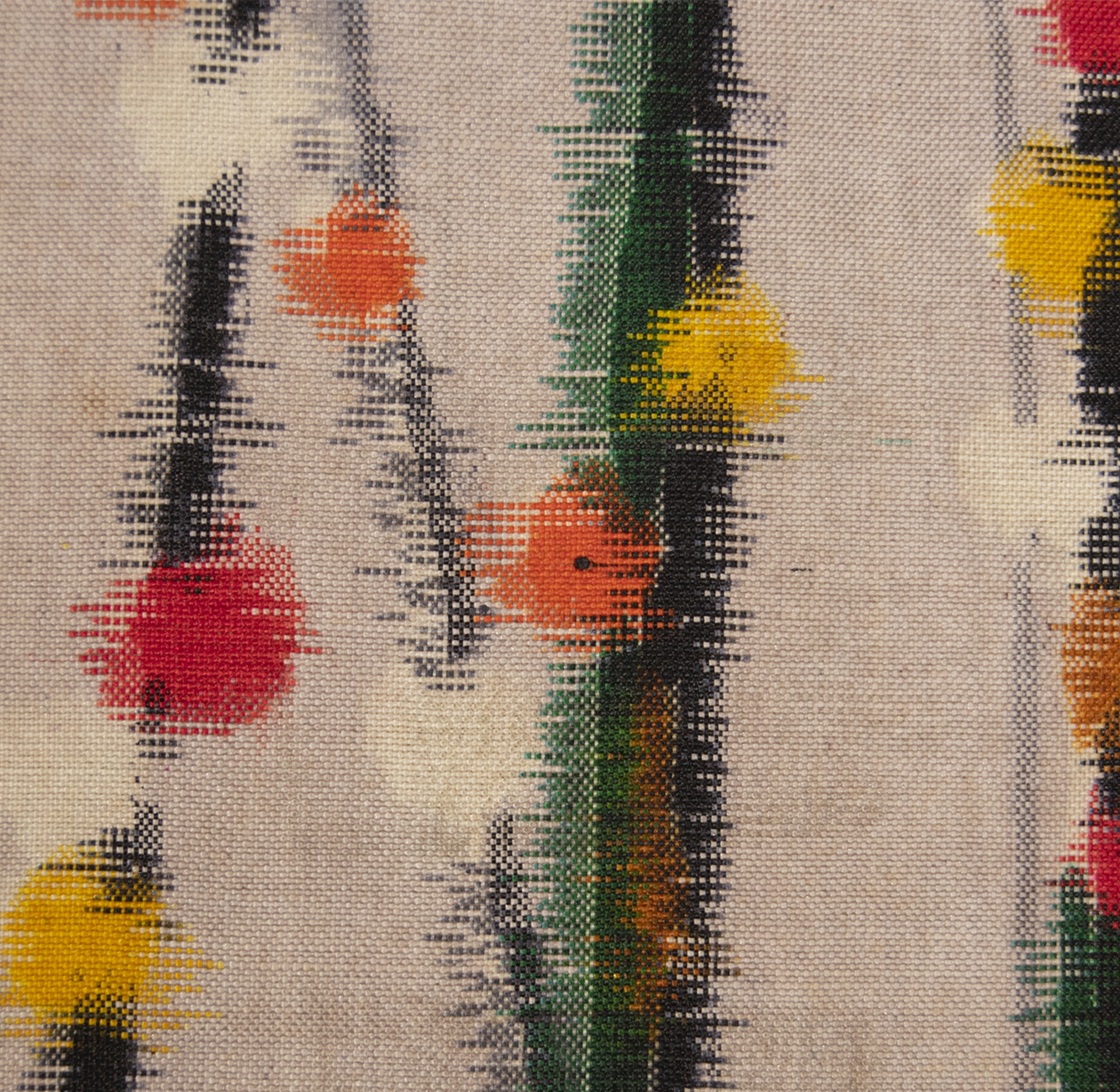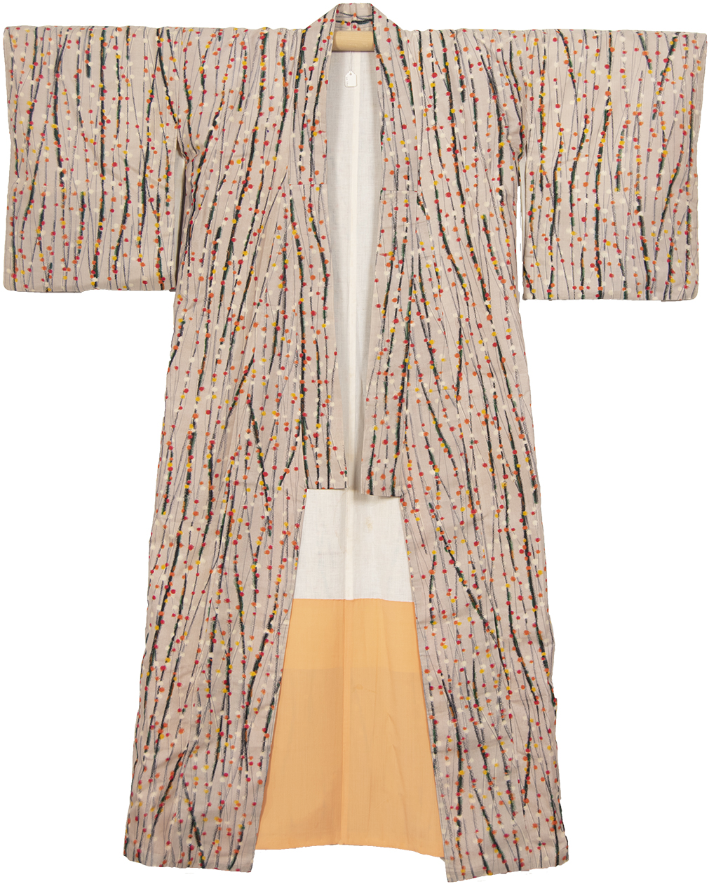 This kimono is very colorful and has an abstract branch design on a gray background. Dark gray and green vertical branches are adorned with red, yellow, orange, and white spots. If you look closely, you can see the feathered edges imitating the look of ikat.