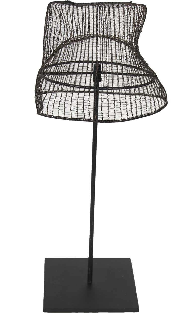 This hat is made of horsehair, specifically the long hairs from a horse’s tail. The inner cap appears to be also made of some metallic wires, and overall the piece is in good condition and includes a custom stand.
