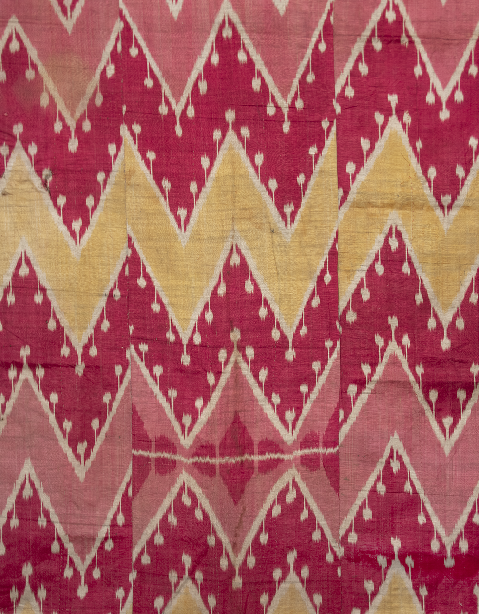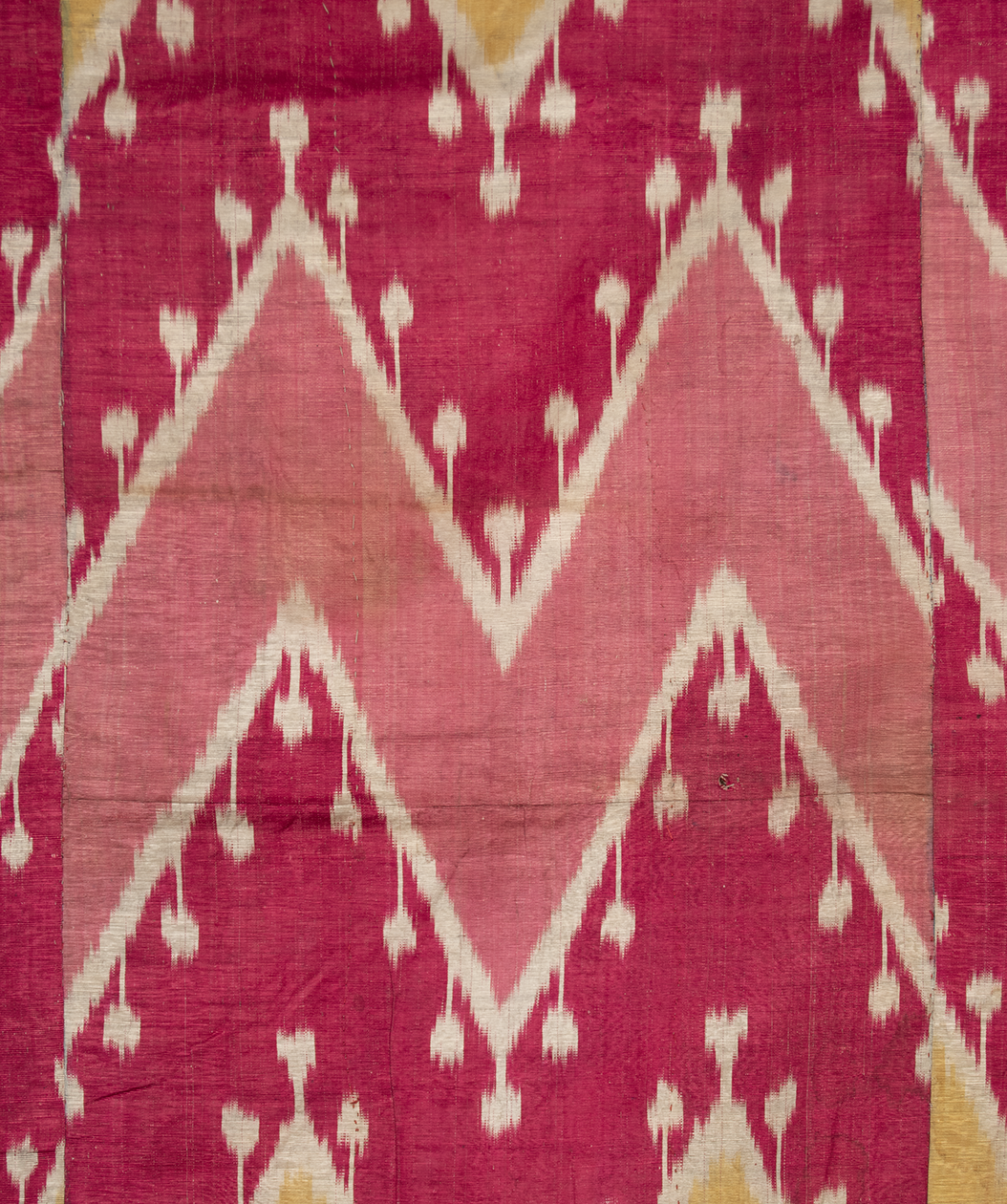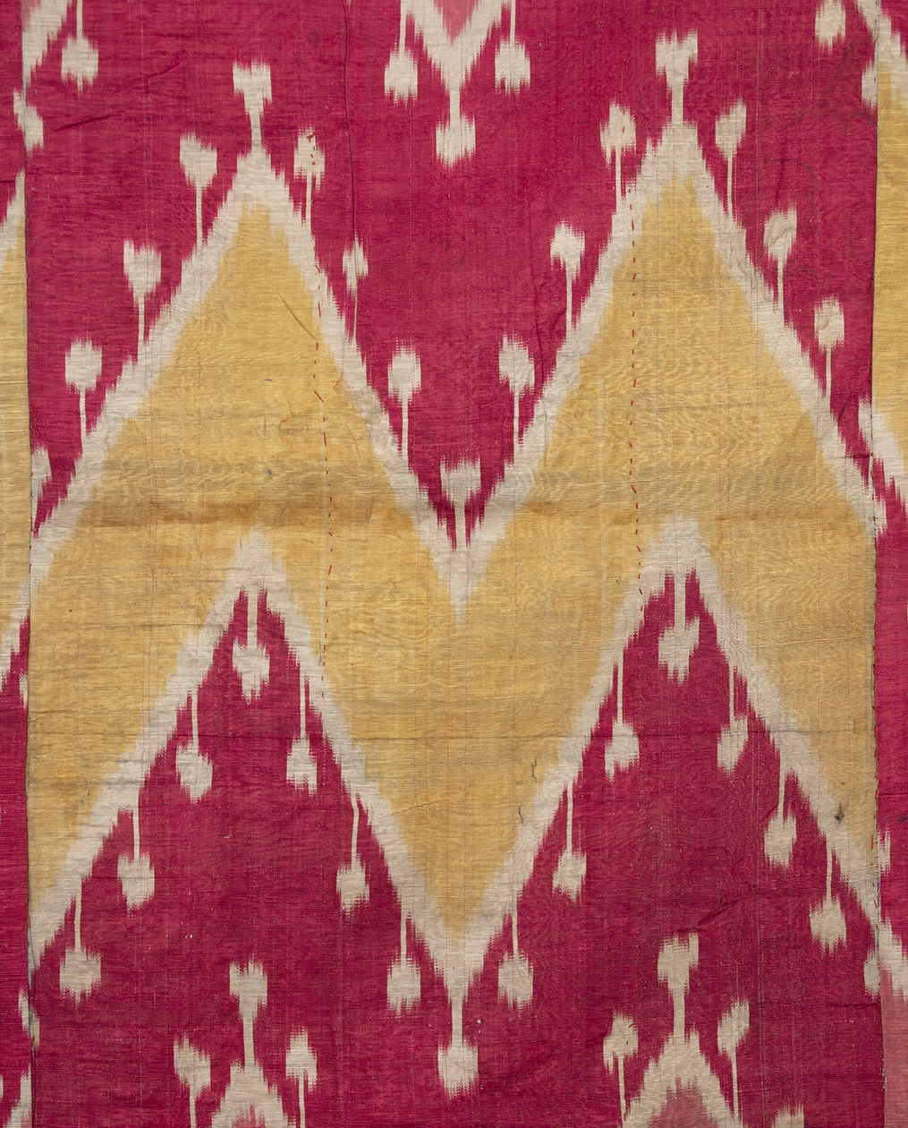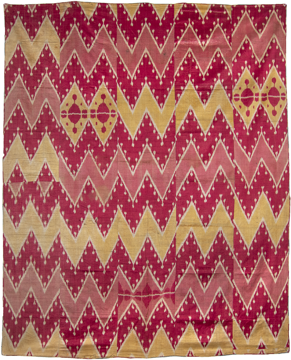 Uzbek ikat of zigzag motif in four colors. The bold geometrical design is nicely complemented by a whimsical splicing of the panels .