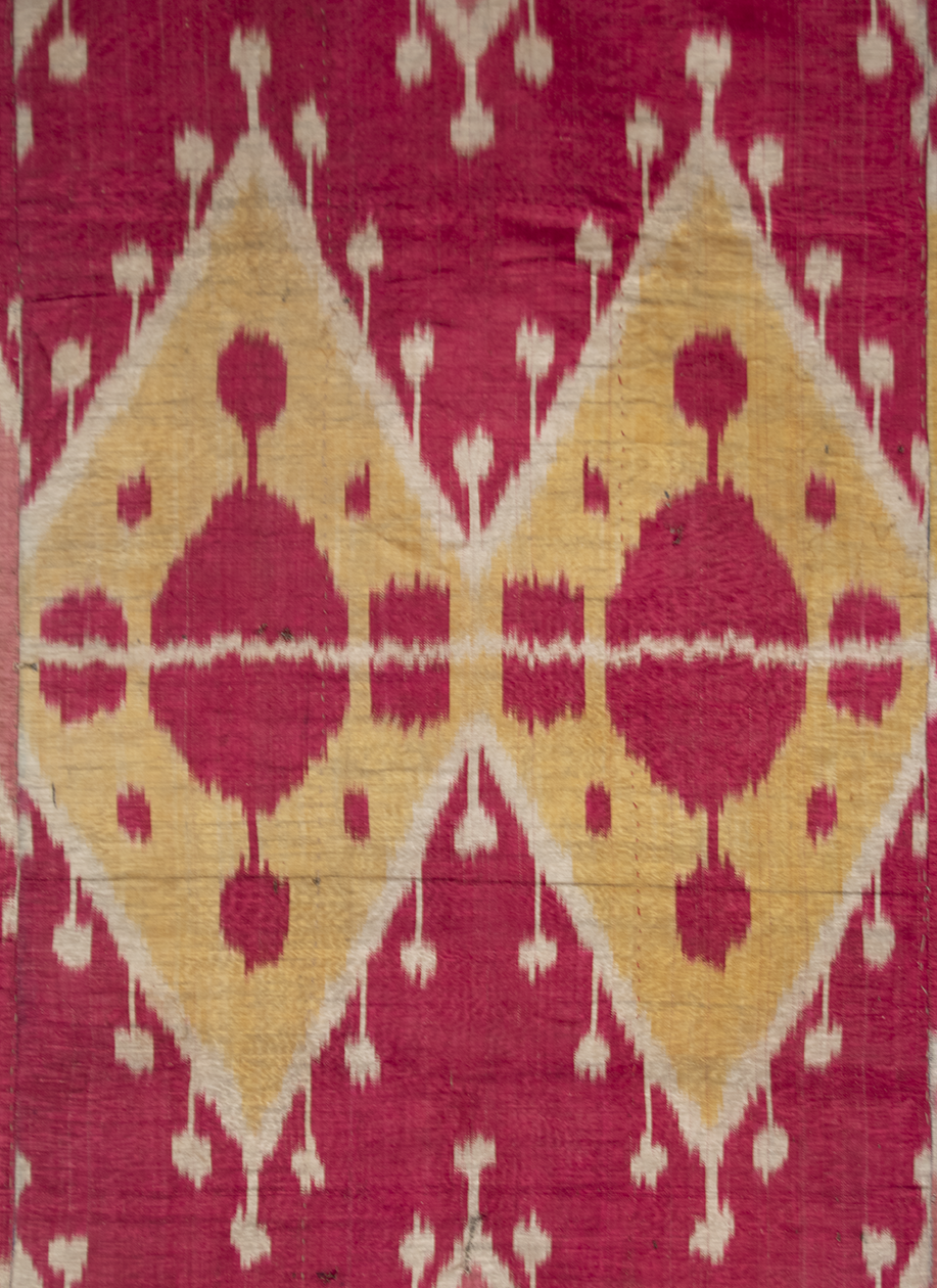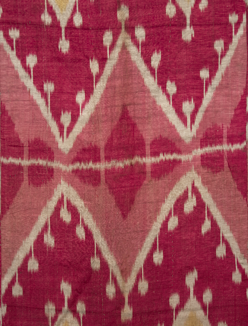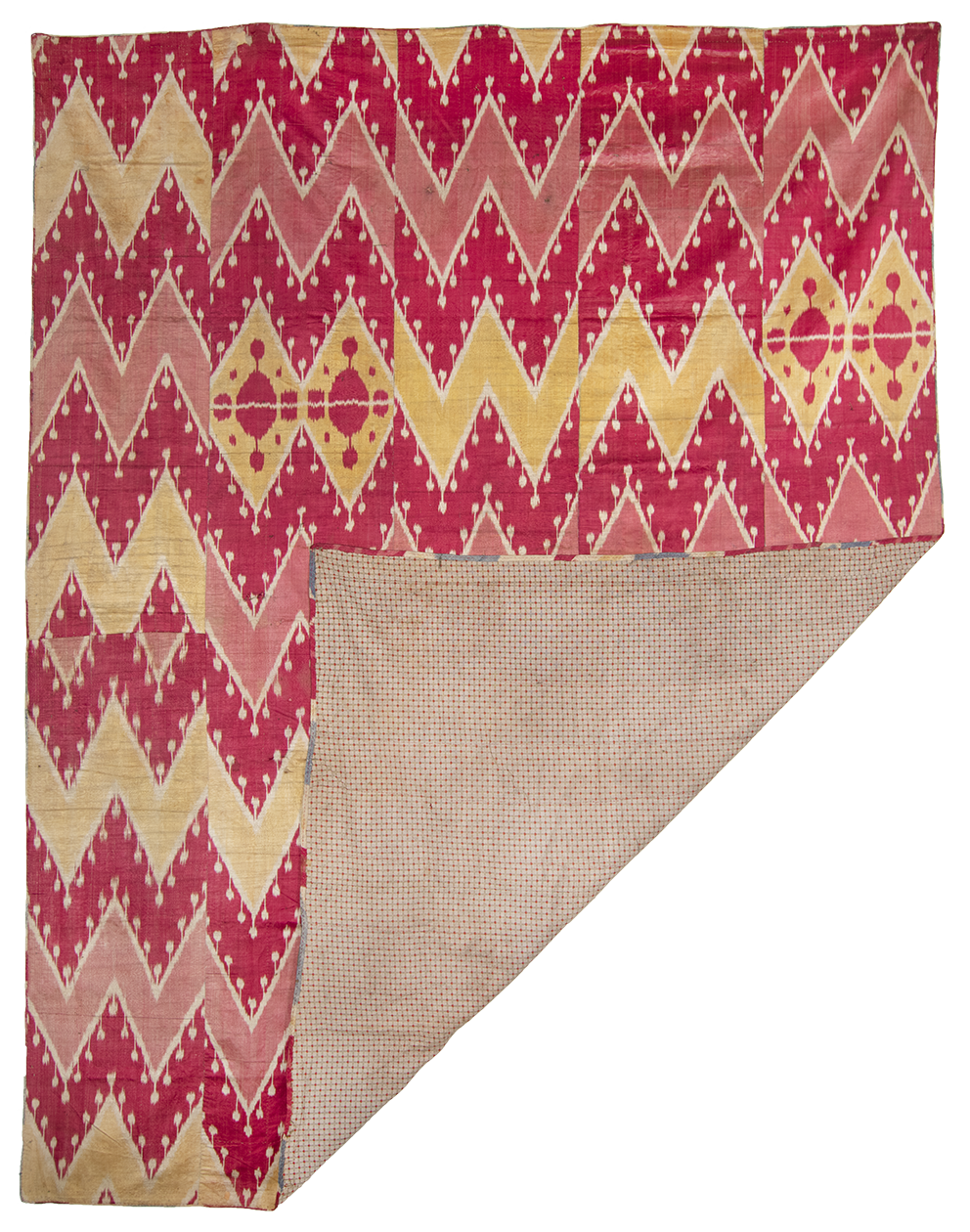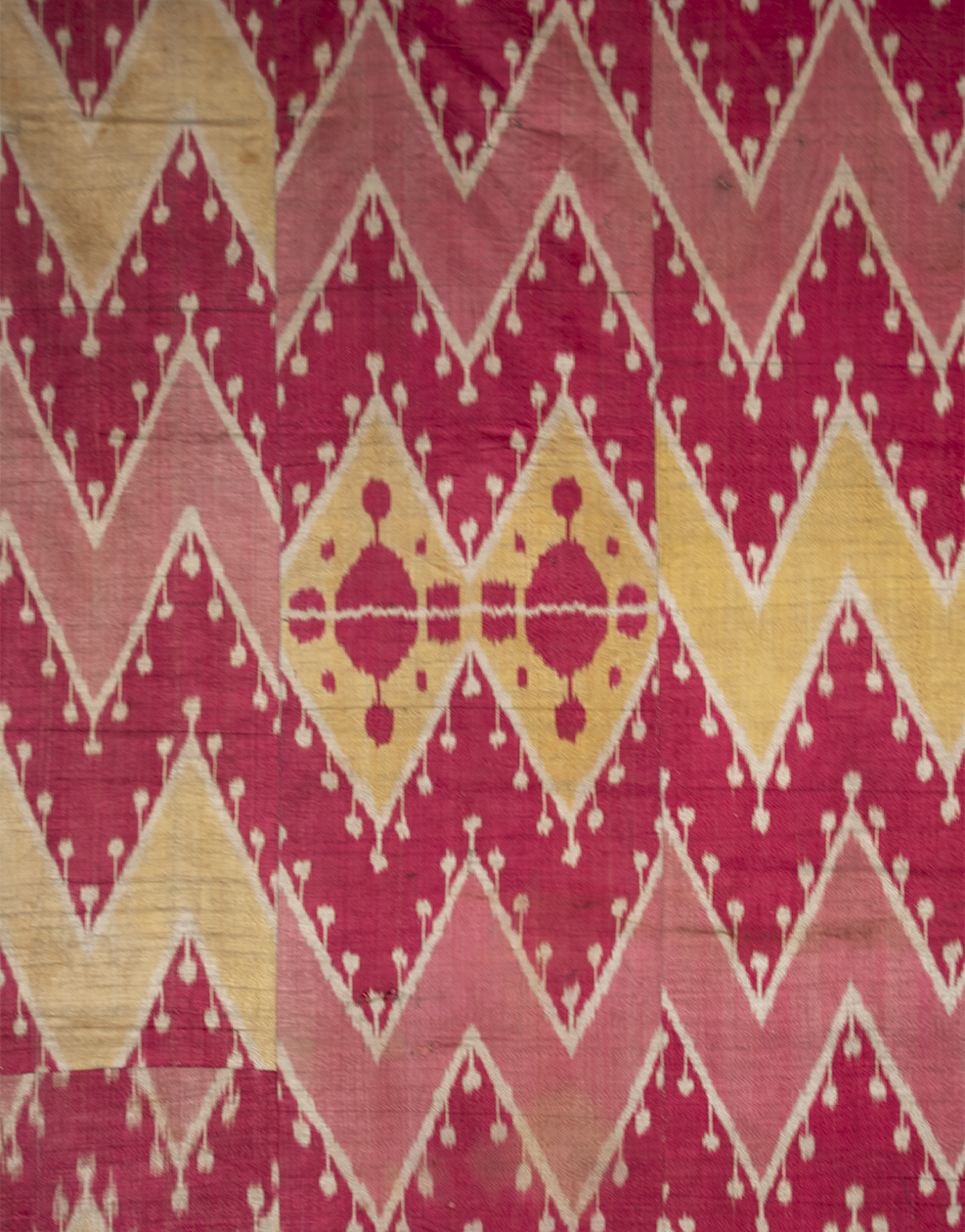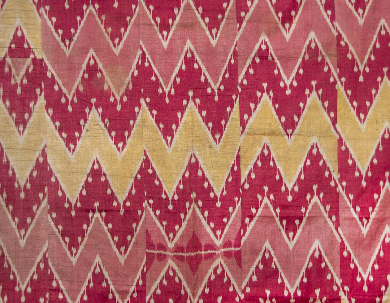 Uzbek ikat of zigzag motif in four colors. The bold geometrical design is nicely complemented by a whimsical splicing of the panels .
