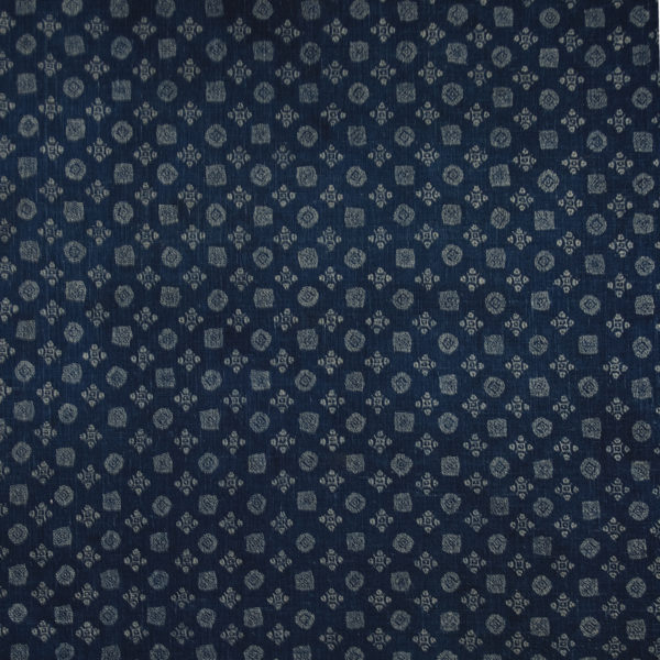 Javanese sarong patterned in hand stamped wax resist, a technique similar to the Indian Kalamkari .The design was applied using hand carved stamps that were parts of a larger stamping tool that provided efficiency and proper spacing. Here the stamping was applied to a white tabby cotton which was then dyed in beautiful indigo. Once boiled and washed, the stamped designs lost the wax and reverted to white. Three stamp motifs ; round, square and diamond shapes that are further filed with geometrical and biomorphic all elements. Borders of stripes with some cracking patterns.
