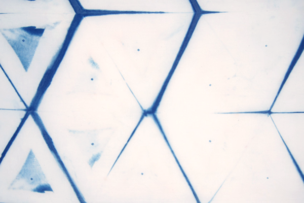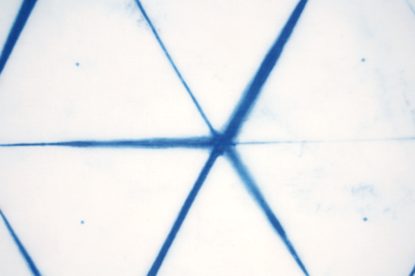 Shibori is the inclusive Japanese name for all tie dyeing techniques. There are many types of shibori depending on how the dyed yarn is manipulated. Shibori can be achieved with binding, stitching, folding, twisting, compressing and other methods. The most famous method is the one where grains of rice are tied individually. Itajime shibori is a shaped resist technique. The cloth is sandwiched between two shaped pieces of wood that are held in place with clamps thus preventing the dye from penetrating the cloth they cover.