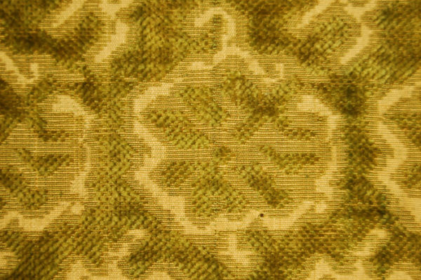 Panel of cut and uncut voided velvet. The design is of allover small scale branches in diagonal rows in dark green set against a yellow or light brown ground. The panel is comprised of two widths of selvedge to selvedge plus a cut width sewn together lengthwise. Quite a few variation to this design exist , one in The Musees Royaux d Art et d Histoire, Brussels and another in the Robert Lehman collection of European textiles.