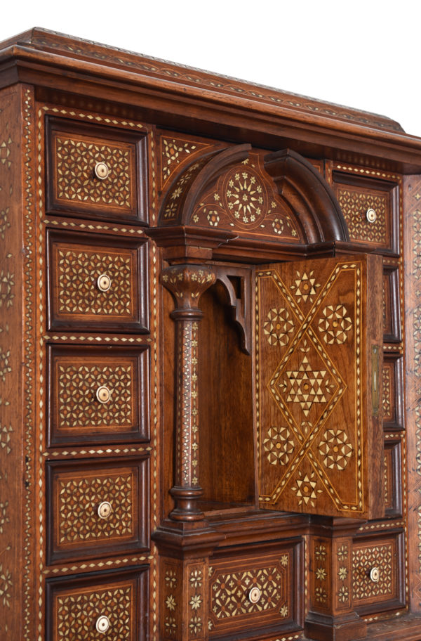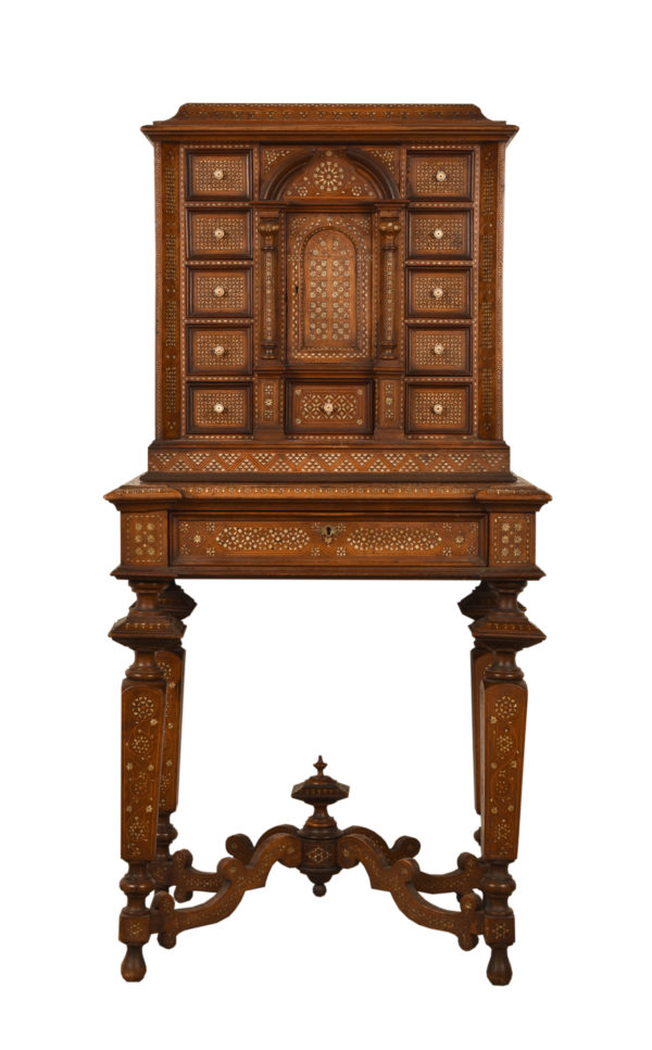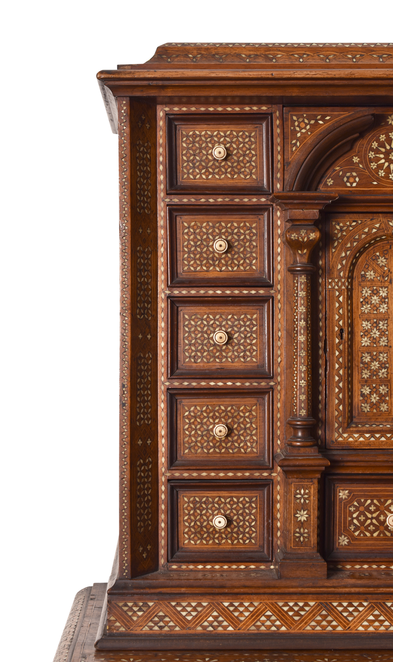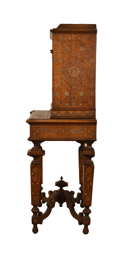 Bottom has one large drawer and carved stylized legs. The top has five drawers on each side with a compartment and one additional drawer in the center. All heavily inlaid in floral and grid motifs. Beautifully patinated surfaces. Maker stamped, Ebonista Milano.
