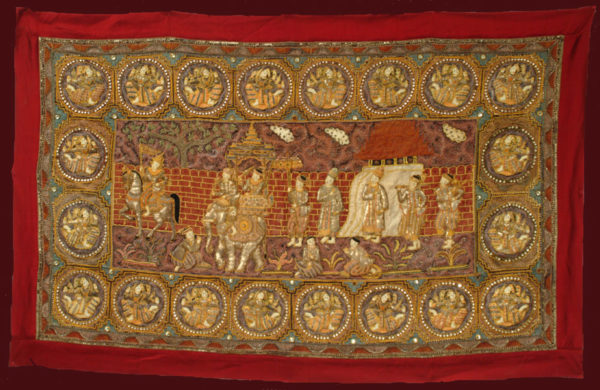 This Kalaga wall hanging was made in Mandalay, Burma in the 20th century. It was constructed of heavy cotton which was appliqued, quilted, sequined, jeweled and couched with metallic thread. Facial details were painted in. It illustrates a religious procession, surrounded by a wide border containing dancers and musicians.