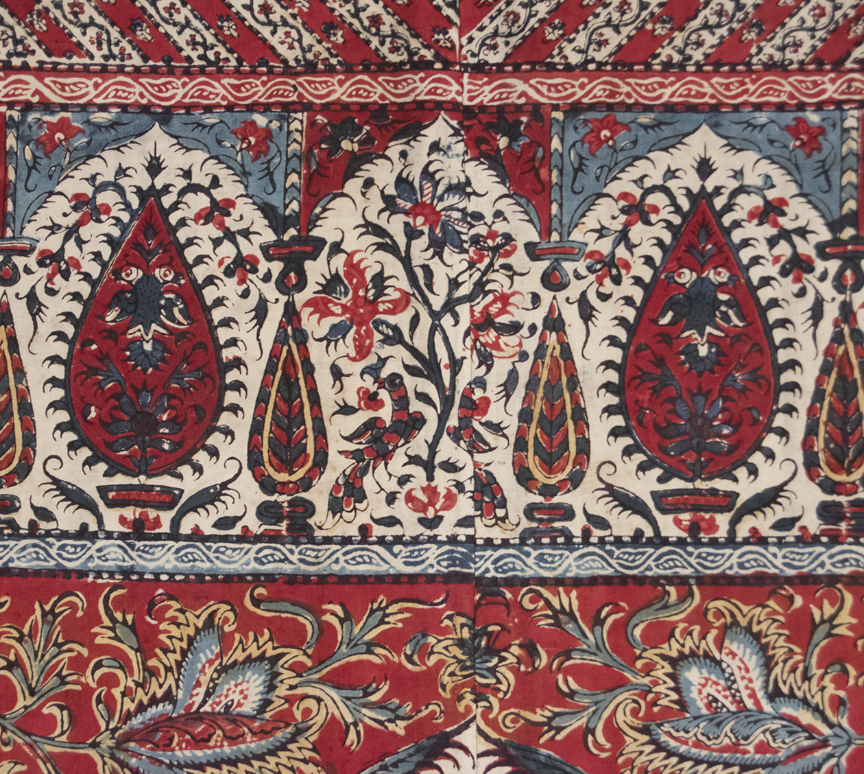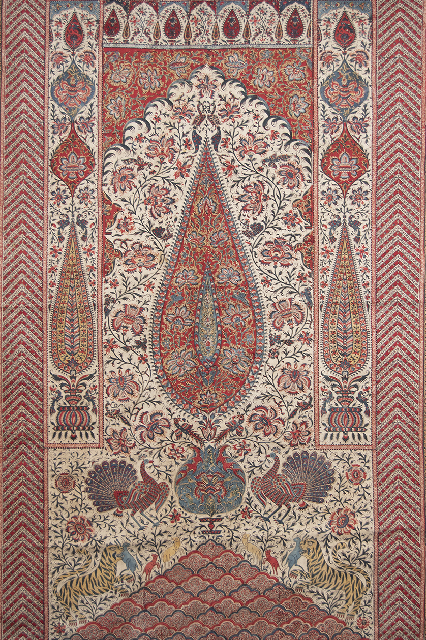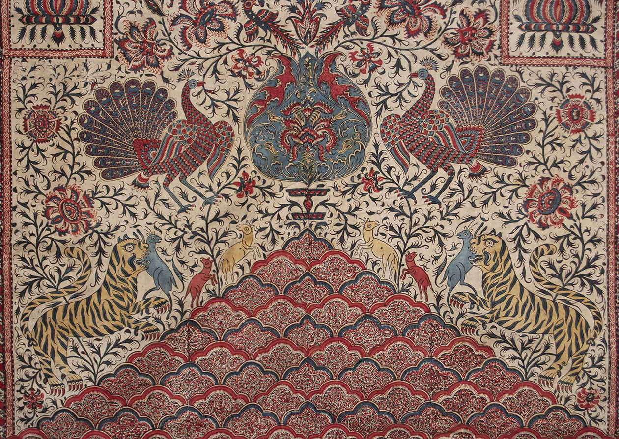 Illustrative textiles began as a way to tell stories about Hindu mythology, instead of relying on word of mouth. The tree of life is a common motif, and it expresses the interconnection of all life on our planet. The top of the tree reaches to the sky, and the roots connect to the earth. The tree is surrounded by vines, flowers, peacocks, tigers, and deer.