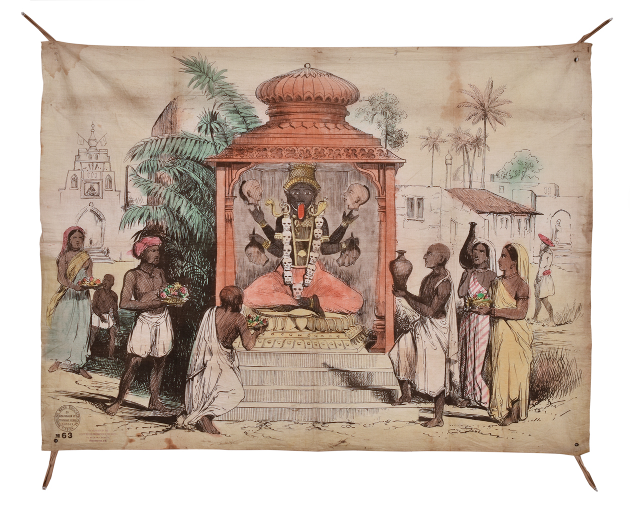 This banner shows the Hindu goddess Kali sitting with four arms, the bottom two holding severed heads by their hair and the top two balancing severed heads. It was printed for a Foreign Ministry organization in London in order to teach the working class.