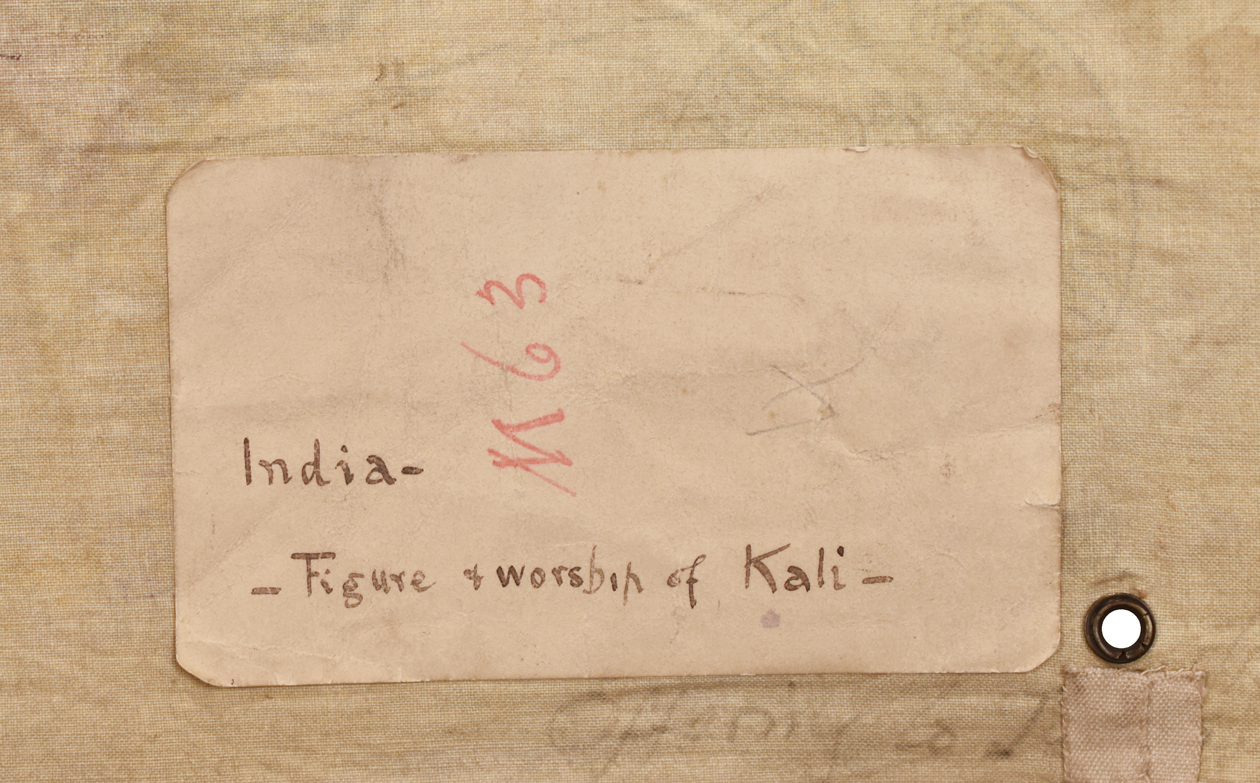 In the bottom left corner there is a stamp stating ‘The Property of the Society for the Propagation of the Gospel, 19, Delahay Street, Westminster, S.W.’. This was an Episcopalian Foreign Ministry Organization based in London. There is also a seal from the ‘Working Men’s Educational Union from 25 King William Street, Trafalgar Square London’. The Working Men’s Educational Union was a philanthropic society founded in 1853 to provide education to the working classes. This hanging would have been used in their lectures, held at various locations, to illustrate the latest advances in knowledge. This was printed on cotton to avoid a paper tax and also presumably because it is reusable. There is a brass eyelet in each corner and ‘M63’ is printed both on the front and the back with ‘India-Figure and worship of Kali’ written on a label on the back.