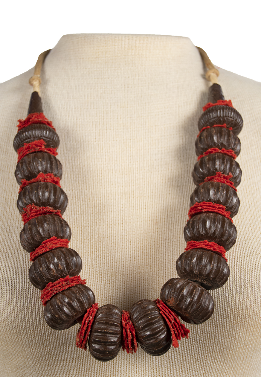 Kantha necklaces such as this one were worn by married women in eastern Nepal. The beads are made of metal, most likely iron. They alternate between stacks of red felt, which are for aesthetic purposes, but also to protect the beads. They are strung together with cotton.