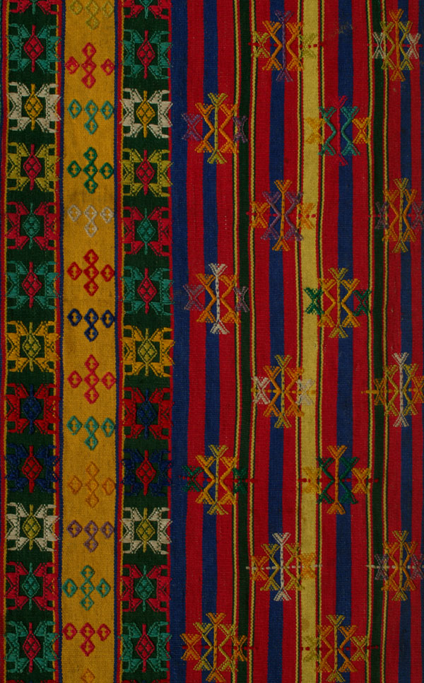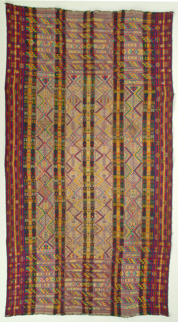 Kira is a Bhutanese dress for a woman. It is a large , rectangular textile that is wrapped around the body, folded into a wide pleat in front and fastened at the shoulders with ornate silver and gold brooches. The dress is belted tightly and bloused about the waist to form a pouch. A kira is worn over a blouse and topped by a jacket.This kira is made of cotton with raw silk patterning. It was woven as a long narrow panel with supplementary weft and then cut into three panels and joined in the warp direction.