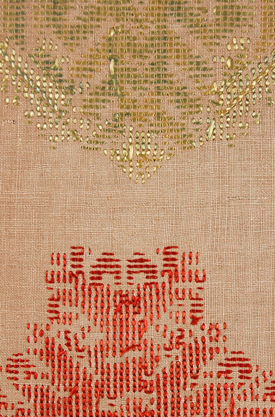 Bed tents, or sperveri, are peculiarly Dodecanese. They are constructed of numerous panels, mostly embroidered and they taper toward the top, with valances front top and bottom. Their purpose ,of course, is to shield from flying insects. The decoration is also uniquely Dodecanese, featuring rows, vertical and horizontal, of flower pots, or glastras, that are large, compact and contained. Rhodes and Kos, two of the bigger Dodecanese Islands, have similar bed tents, the difference mainly in the stitchwork which is heavy cross stitch in Rhodes and fine single darning stitch in Kos.