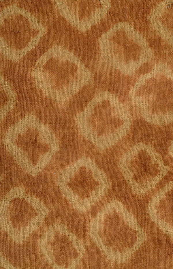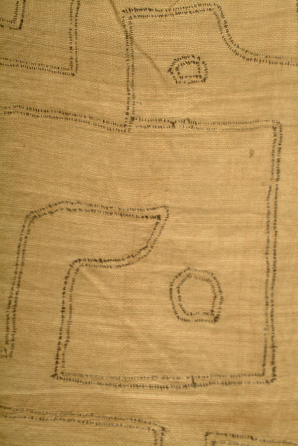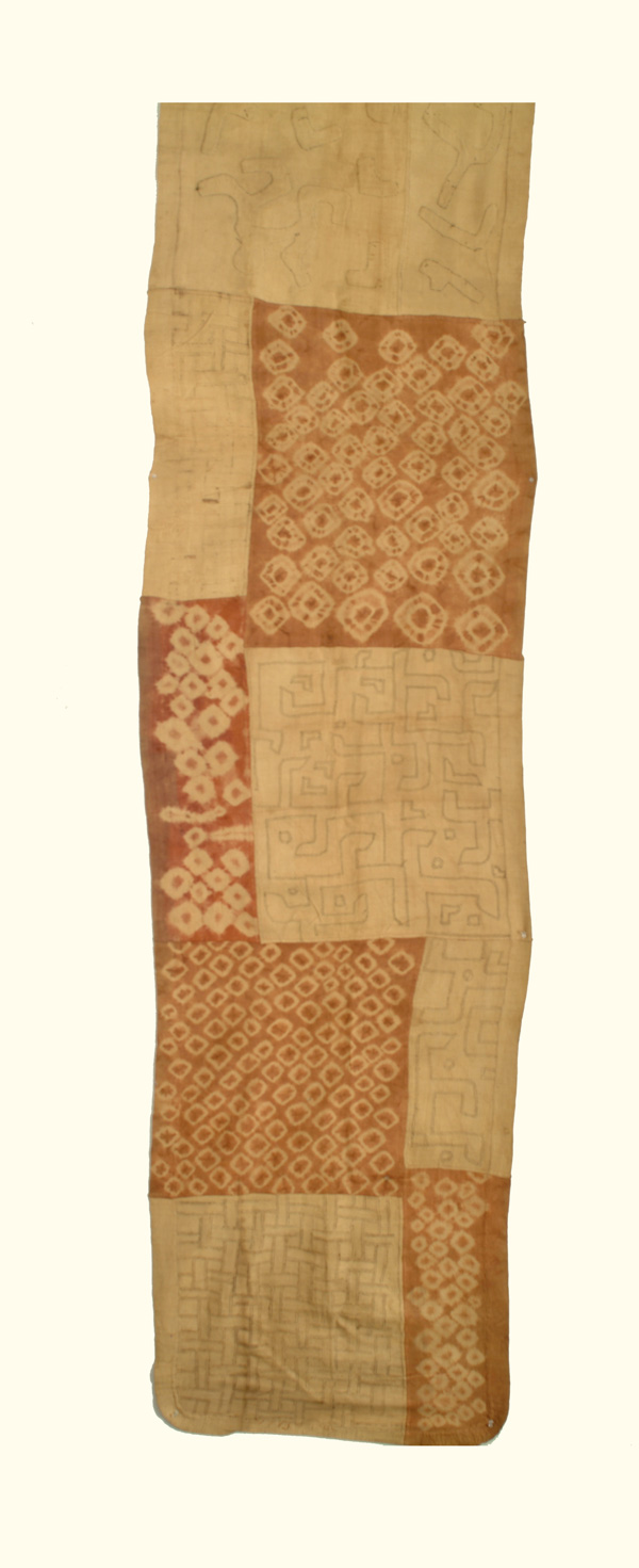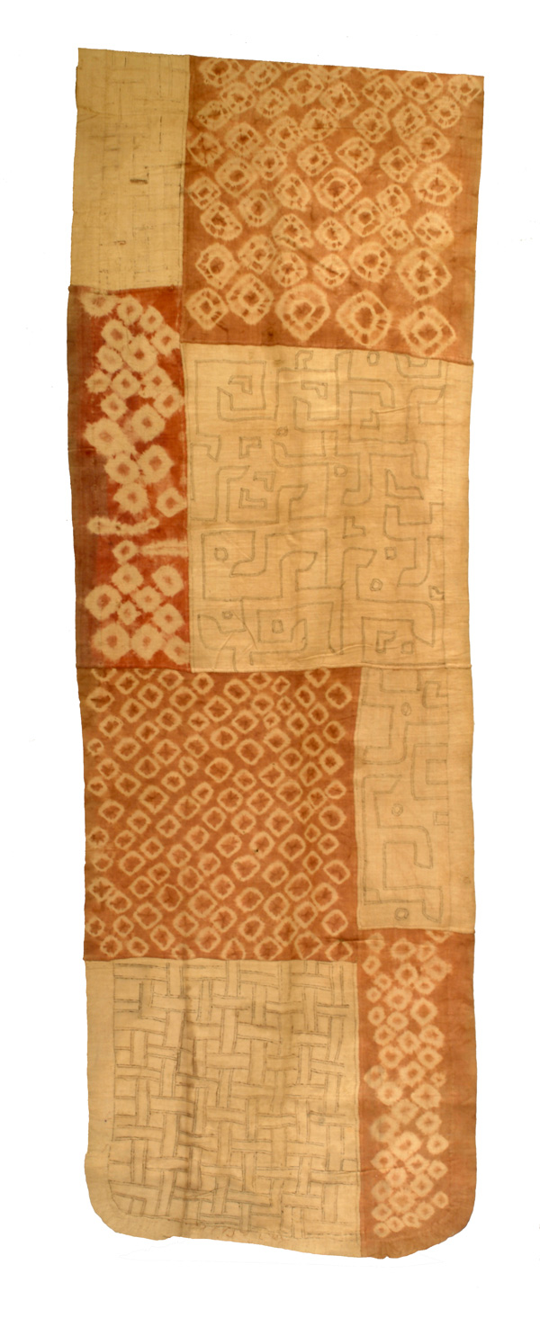Resist-dyed and appliqued ceremonial skirt; made of raffia fibers woven on small looms into rectangles that are sewn together. Kuba kingdom, Kasai region, Zaire.