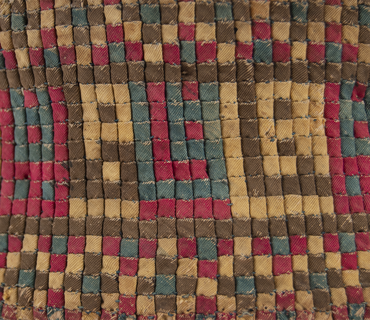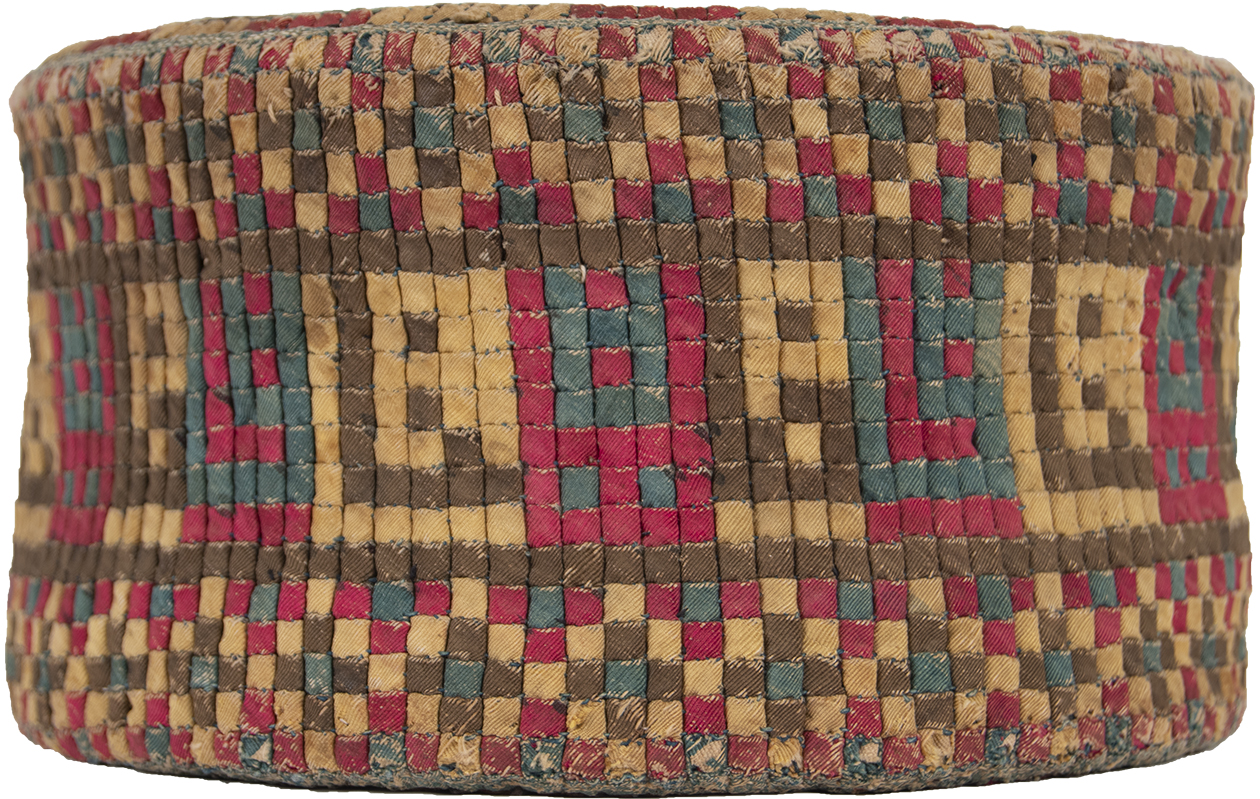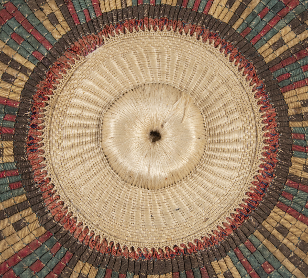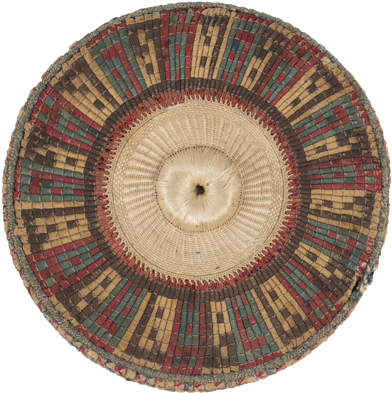 Making these hats was a labour intensive job. About 3,500 individual pieces of silk cut on its bias have been sewn together masterfully to create this hat. It is decorated with colorful, geometric patterns and the center is a circle made of silk thread. An interior structure of straw holds its shape, and it is dyed with a faint pattern. Modern versions of these hats feature embroidery instead of the sewn silk fragments.