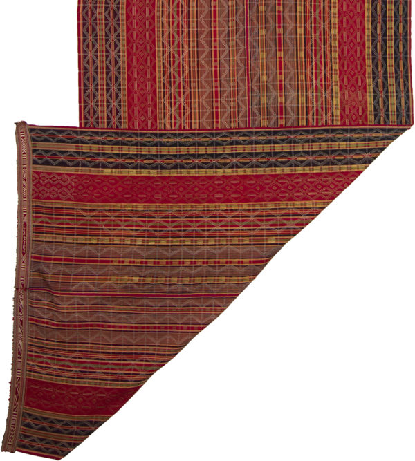 A large striped silk panel with weft silk brocading. The colorful linear design features diamond shapes and zigzag overlay. Material like this was made for Kurdish men’s garments.   Kurds, the largest ethnic group without a country of their own, live primarily in four countries: Turkey, Syria, Iraq and Iran. This panel was woven in Iran in 1903, details woven into one of the selvedges.