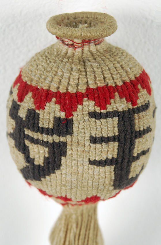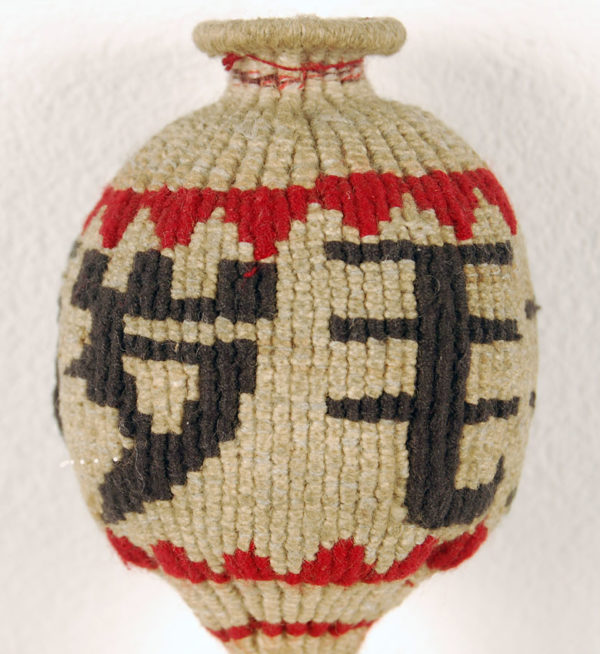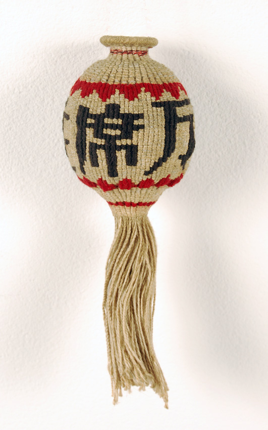 This object could be an aromatic pouch but since its neck opening is very small and has minimal wear it could also be a purely ornamental object to be worn during lantern festival.What is less mysterious is its Chinese origin and its age which is third quarter of the 20th century. The Chinese characters extol Mao and China.Also evident is the amount of work that was invested in its creation. Weft faced , warp wrapped three color cotton with no supportive foundation of any other material.