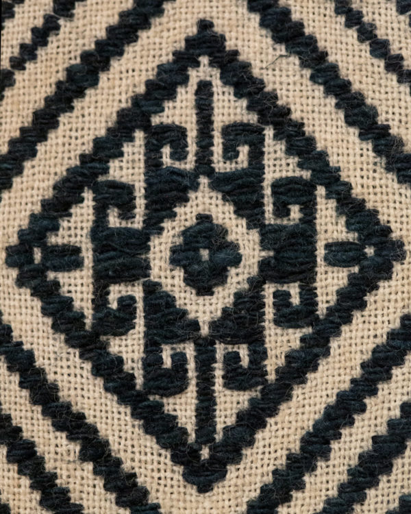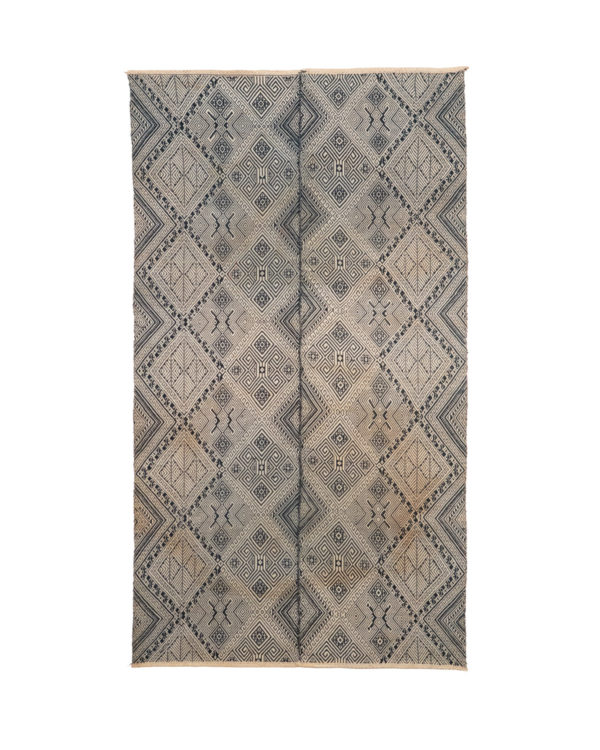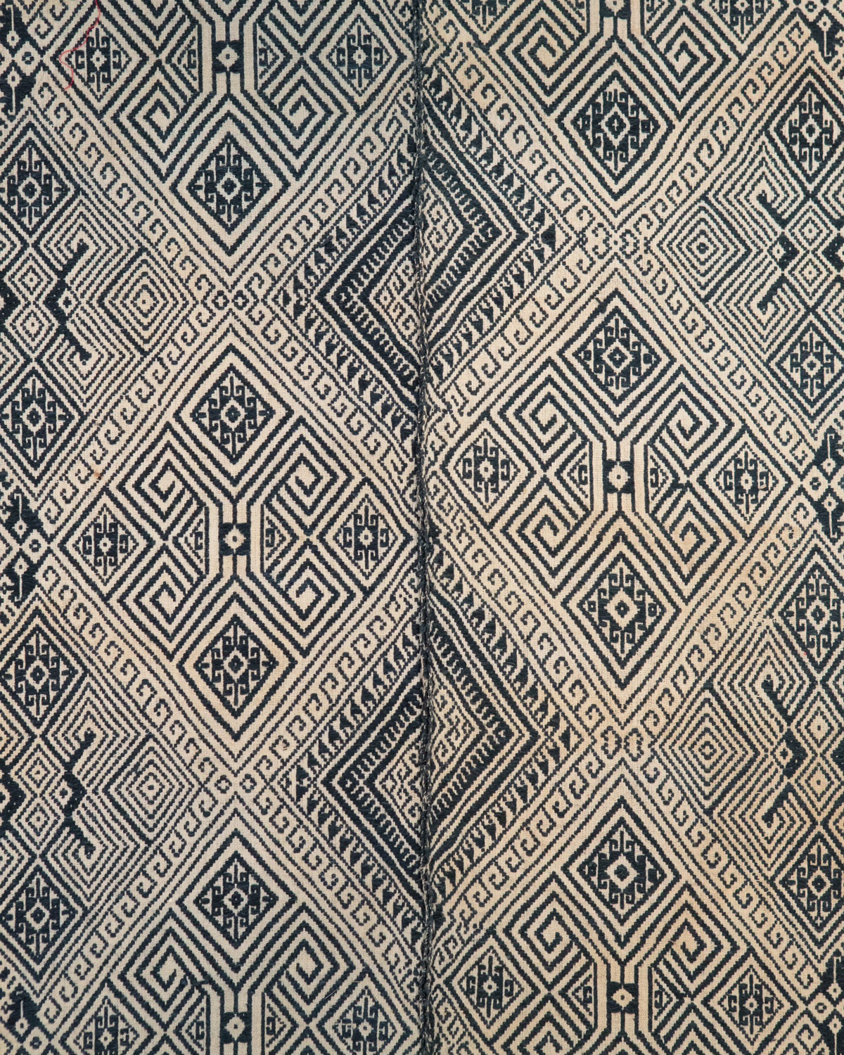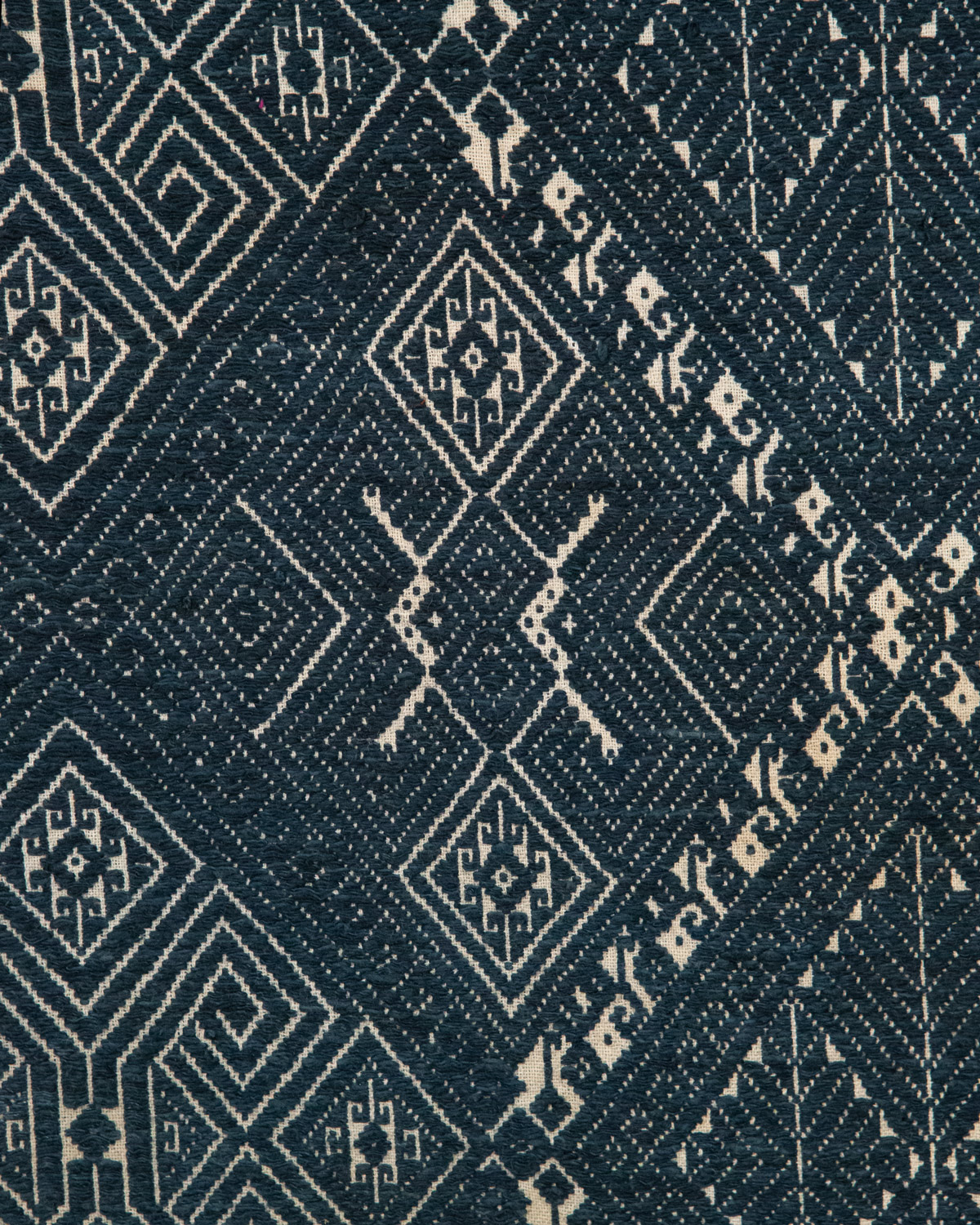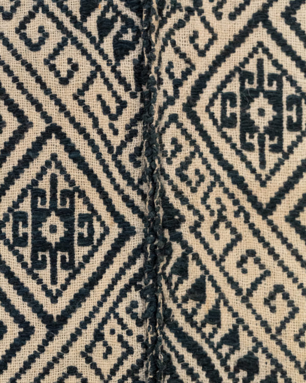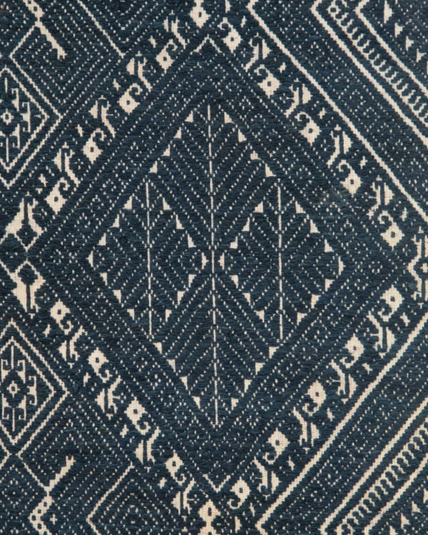 The Lao Tai people of Laos are a part of a larger group spread throughout Southeast Asia – also known as “Shan” in Burma, “Dai” in China, and “Tai” in Thailand. Geometric designs are common in their textile arts, and they sometimes include animal figures such as the monkeys in the border surrounding the outer large diamonds, and ram horns.