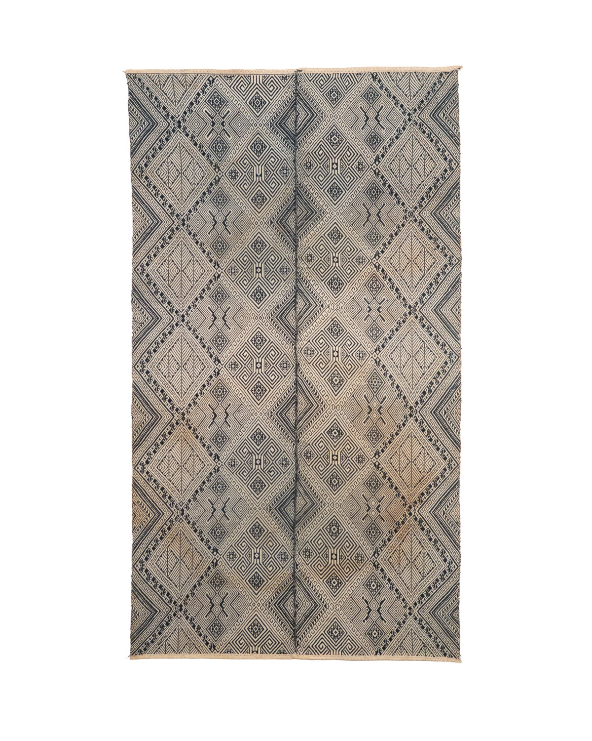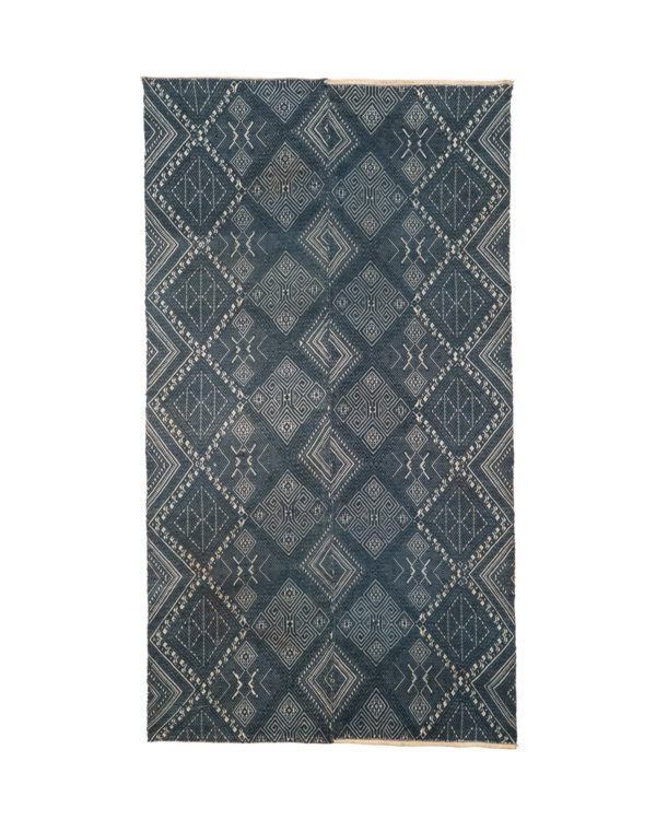 Two cotton panels sewn together and decorated with supplementary indigo cotton weft. The design features rams horns within a diamond grid.
