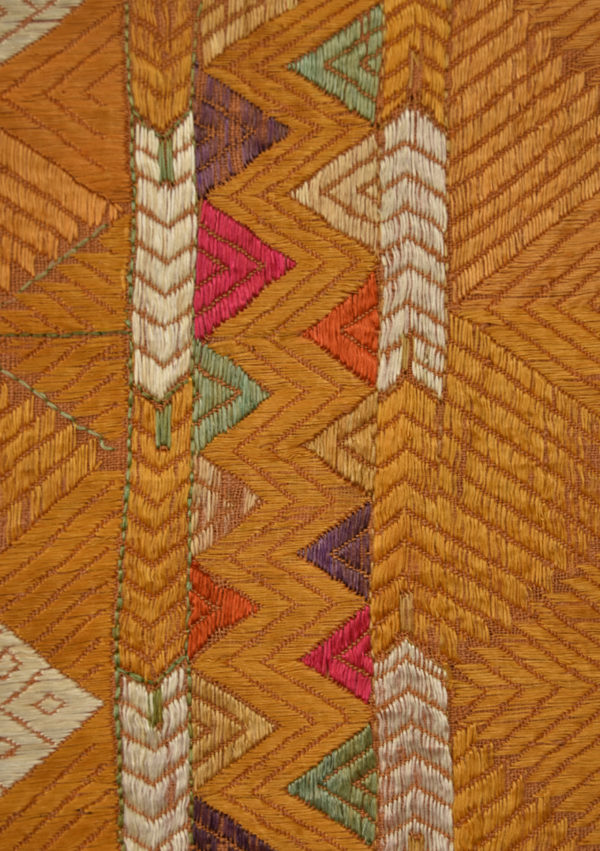 This phulkari was made using a dark red-brown ground fabric and orange, white, and yellow silk thread embroidery. Most of the design is made up of repeating interlocking triangles, but the border is decorated with diamonds motifs and large stand-alone triangles.
