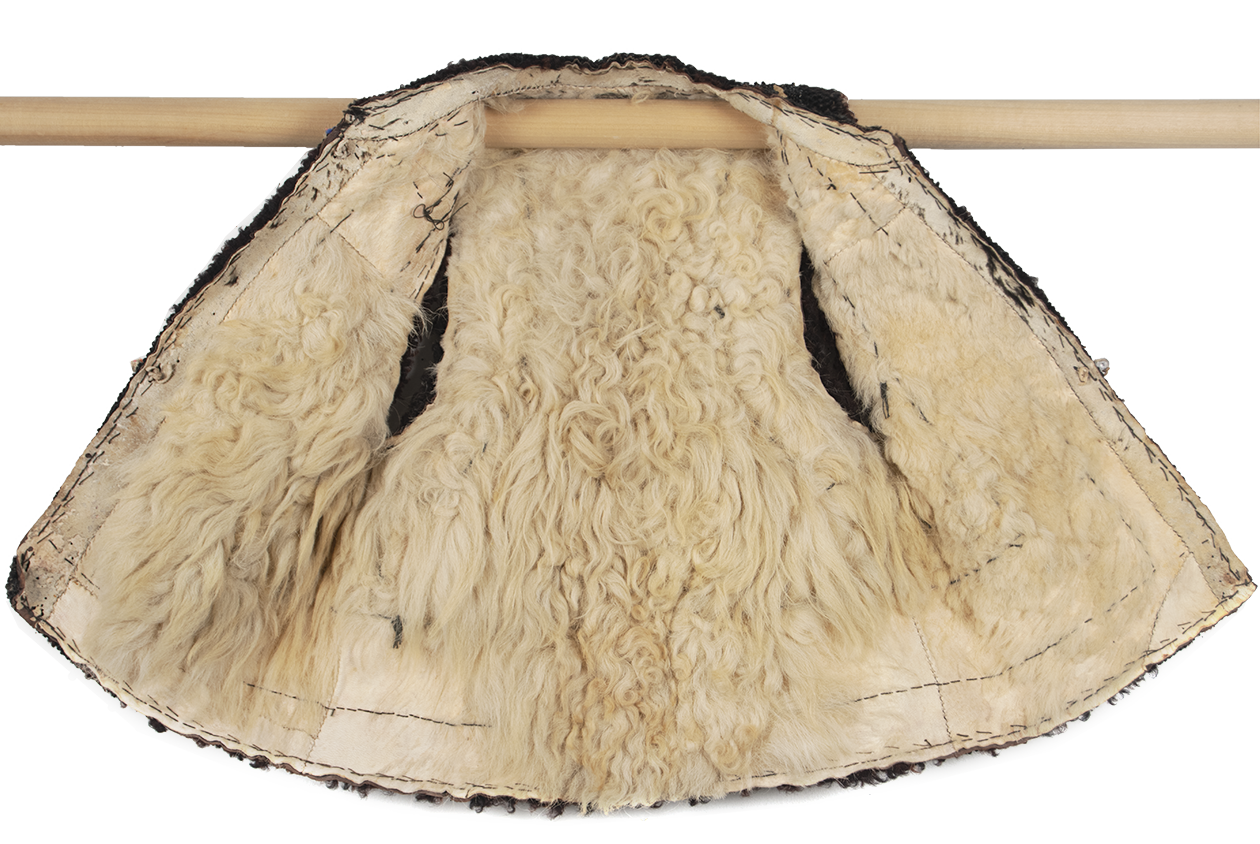 This leather vest, or a Kyptar, is a traditional part of Ukranian folk costume. While both men and women wore this garment, the size of this piece suggests that it belonged to a woman.
