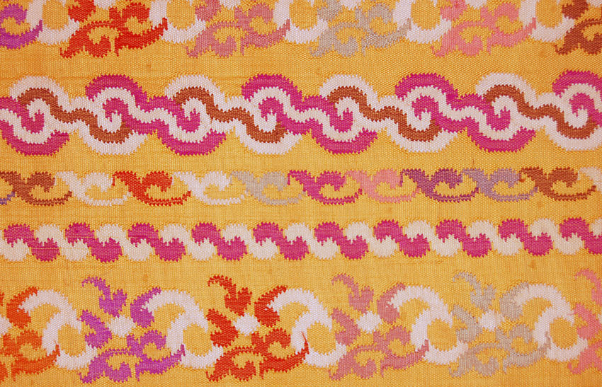 Luntaya acheic is the prized cloth used for skirtcloth, or sarong, in Burma. Luntayas originated as court dress but later came to signify social status outside the court as well. The bright, horizontally patterned silk cloth was woven on a hand loom in an interlocking tapestry technique called acheic. Luntaya refers to the design of horizontal wavelike lines, evocative of the ripples and waves of the Irawaddi, the largest river in Burma.