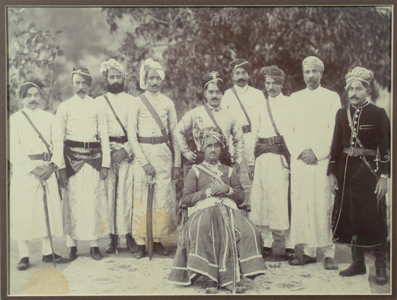 Two Maharajas(center) pose with their guards.The dignitaries wearing brocade, velvet and jewels: the guards in whites.Vintage photographic print.Mounted, glazed and framed.