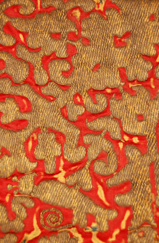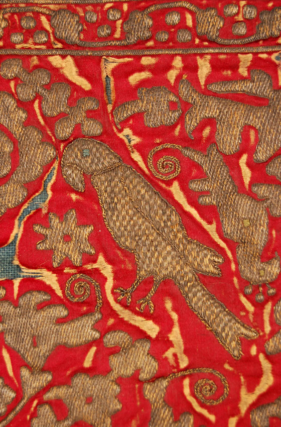 Rectangle of red satin decorated with couched metallic threads. Traditionally used as wall hanging or cover. Later vintage of this type of textile would have the Kajar lion at its center, while in earlier examples the center would be either a sun or a flower. What distinguishes this example is the profusion of birds, most of them parrots and the use of multiple couching techniques and different color couching threads to produce a surface of different textures. The durability was enhanced by having the work stitched into two materials, the bottom being coarse tabby linen. With the satin now shattered all over now, the blue linen peeks through. Still a rare and fine textile.