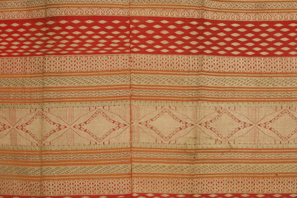 The weaver who made this textile used some of the most iconic Minangkabau motifs including balah kacang (split peanut) and itiak pulang patang (ducks go home in the afternoon). Both motifs are linked back to adat (traditional wisdom). The ovals with concave-sided triangles represent peanuts and the way they naturally separate. This example of natural division is meant to admonish people to share things equally. The long lines with short lines coming off of them are stick-figure representations of ducks. This adat teaching is for people to adhere to adat the way that ducks stay in a line together when farmers take them home in the afternoon.