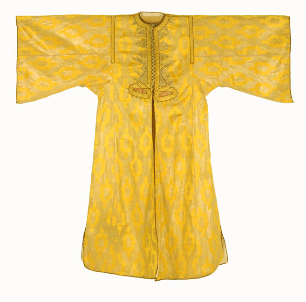 Ceremonial kaftan from Tetouan made from locally produced silk brocade. The stylized pattern stitched together symmetrically and further embellished with metallic ribbon and metallic embroidery. Lined with fine cotton.