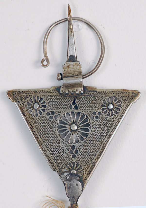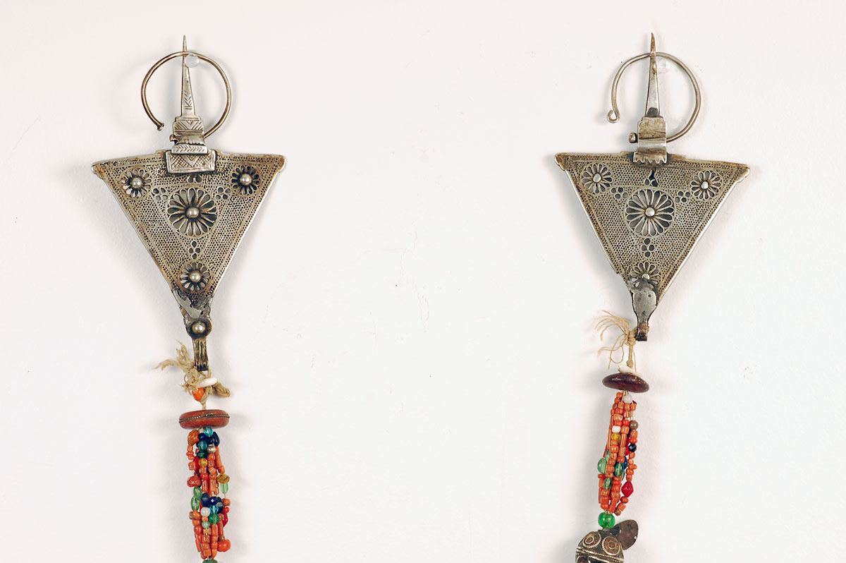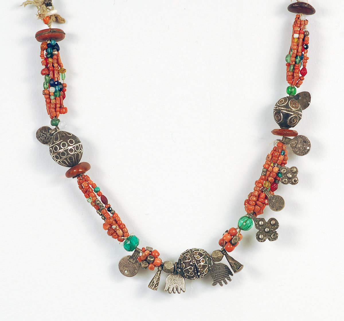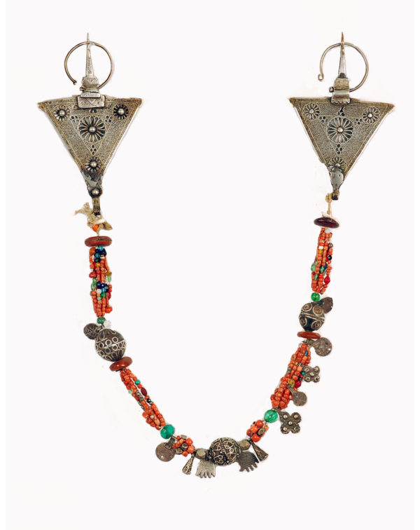 This Imazighen (Berber) necklace or cloak clasp was made in Morocco in the early 20th century. A number of silver amulets, coral beads, and glass beads are strung together to connect two fibulae that would have been used by an Imazighen woman to secure her veil or wrapper.