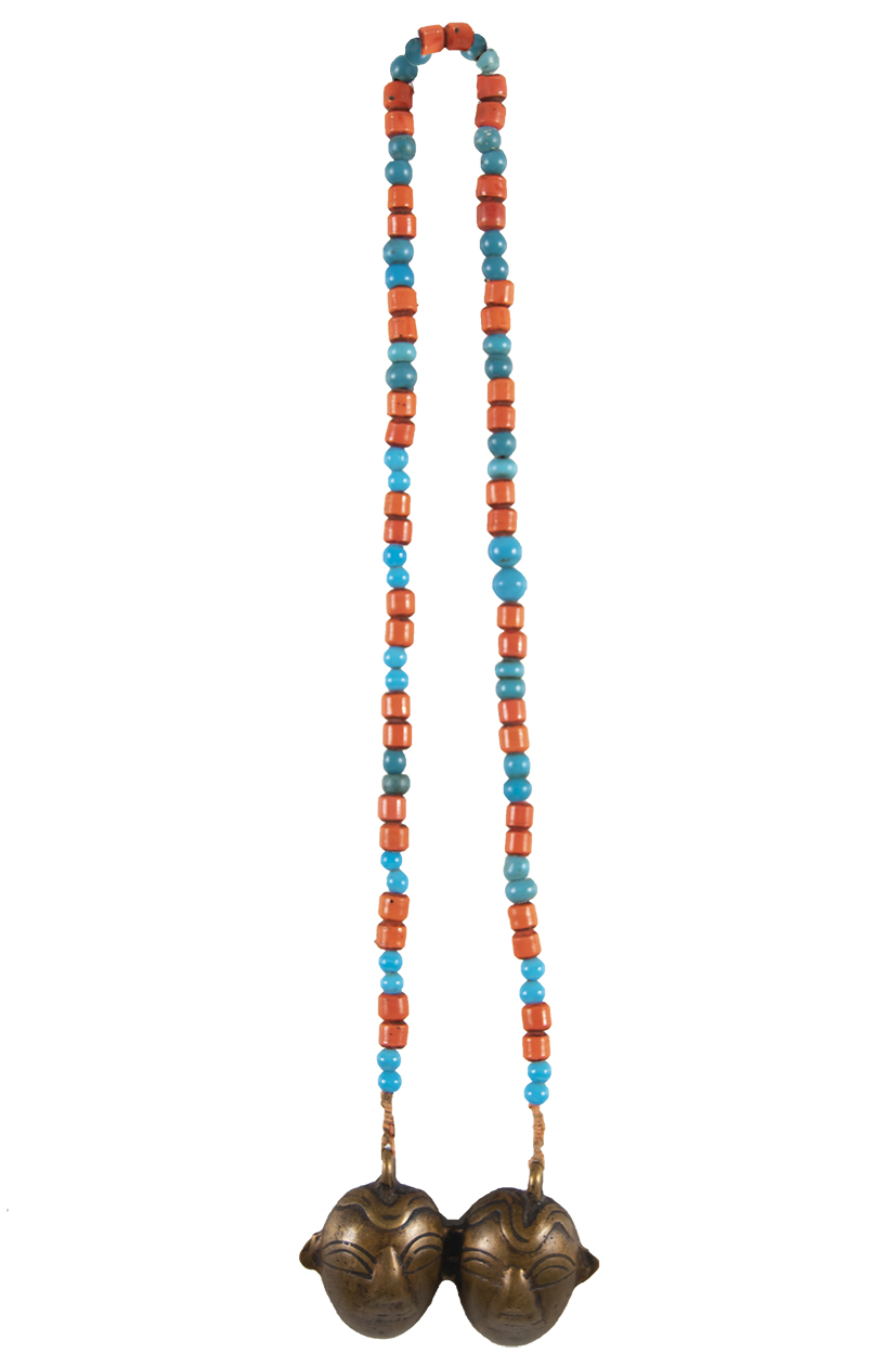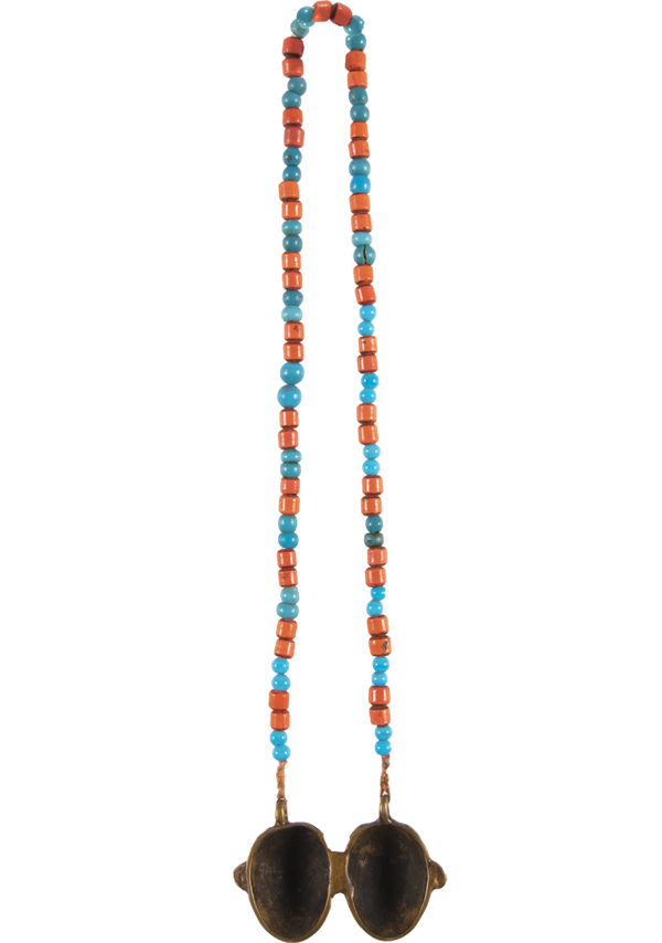 This necklace consists of alternating pairs of orange and blue glass beads, with two brass heads in the center.