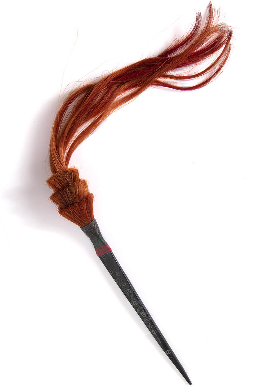 Ornaments such as necklaces, earrings, headpieces, and belts are more than just decorations in Naga culture. They identify the wearer and the group they are from, and express their status. This hair pin is made of a bone from the mithun, an ox-like animal indigenous to Nagaland. It would be worn by men to secure a bun at the back of their head. It is carved with important symbols and adorned with red animal hair.