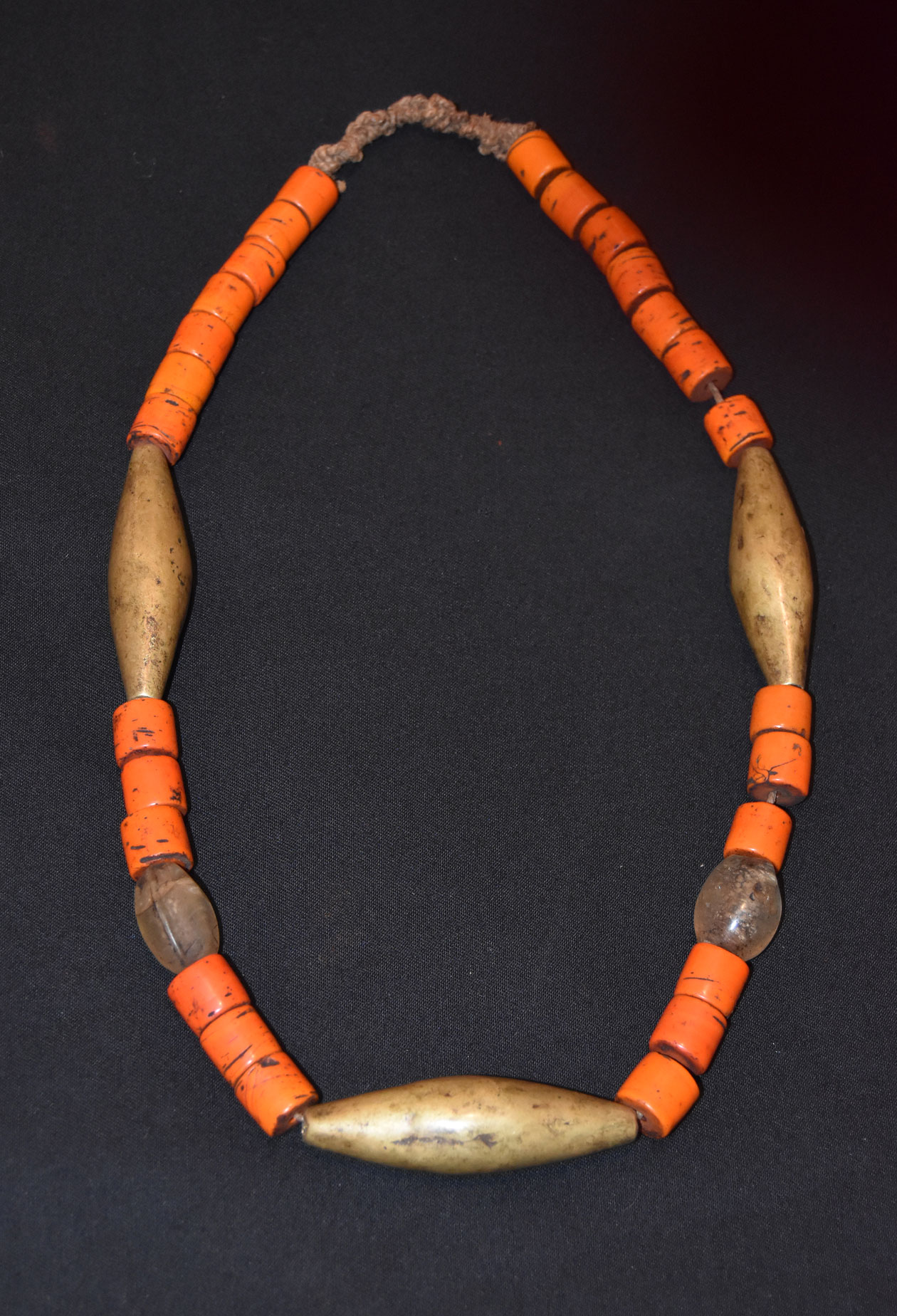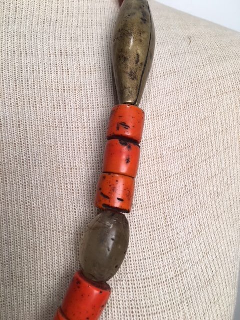 This relatively simple necklace combines three kinds of beads- corals, rock crystal and brass. All these materials were imported. Nagaland is landlocked and Naga tribes neither mine ores nor extract metals from them. Rock crystals were imported from Burma.