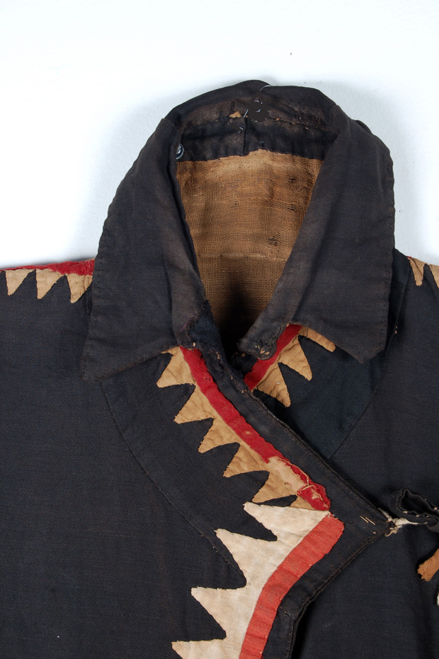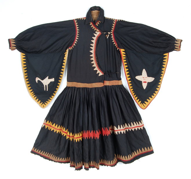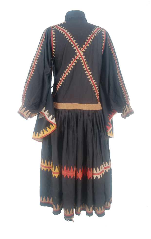 Shaman dress with a long neck opening , pleated skirt and wide sleeves.Made of black tabby cotton and decorated with applique cotton of tan, red and orange cotton.