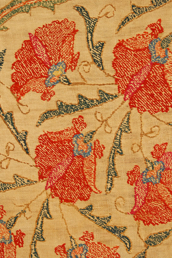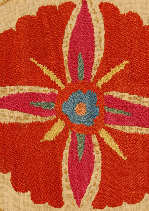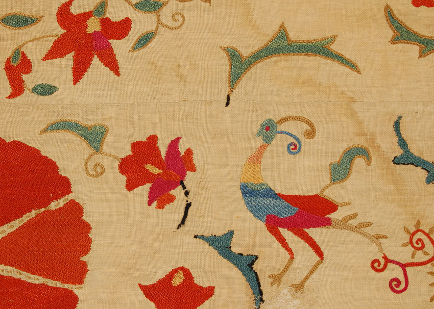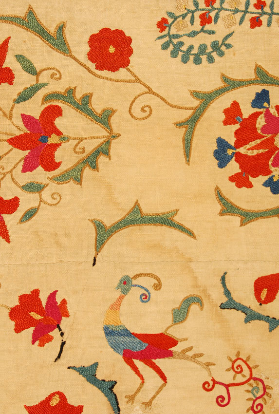 Nurata suzani with a few distinguishing features; first the curious double borders with the inner border dissected by the large corner flowering shrubs; then the main field which is quite empty but pleasingly so. It has a very casual scheme with round flowers alternating with the Nurata shrubs. To top it all those early looking birds, similar to the birds of the embroideries of the Greek Island of Skyros.