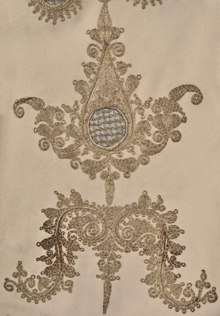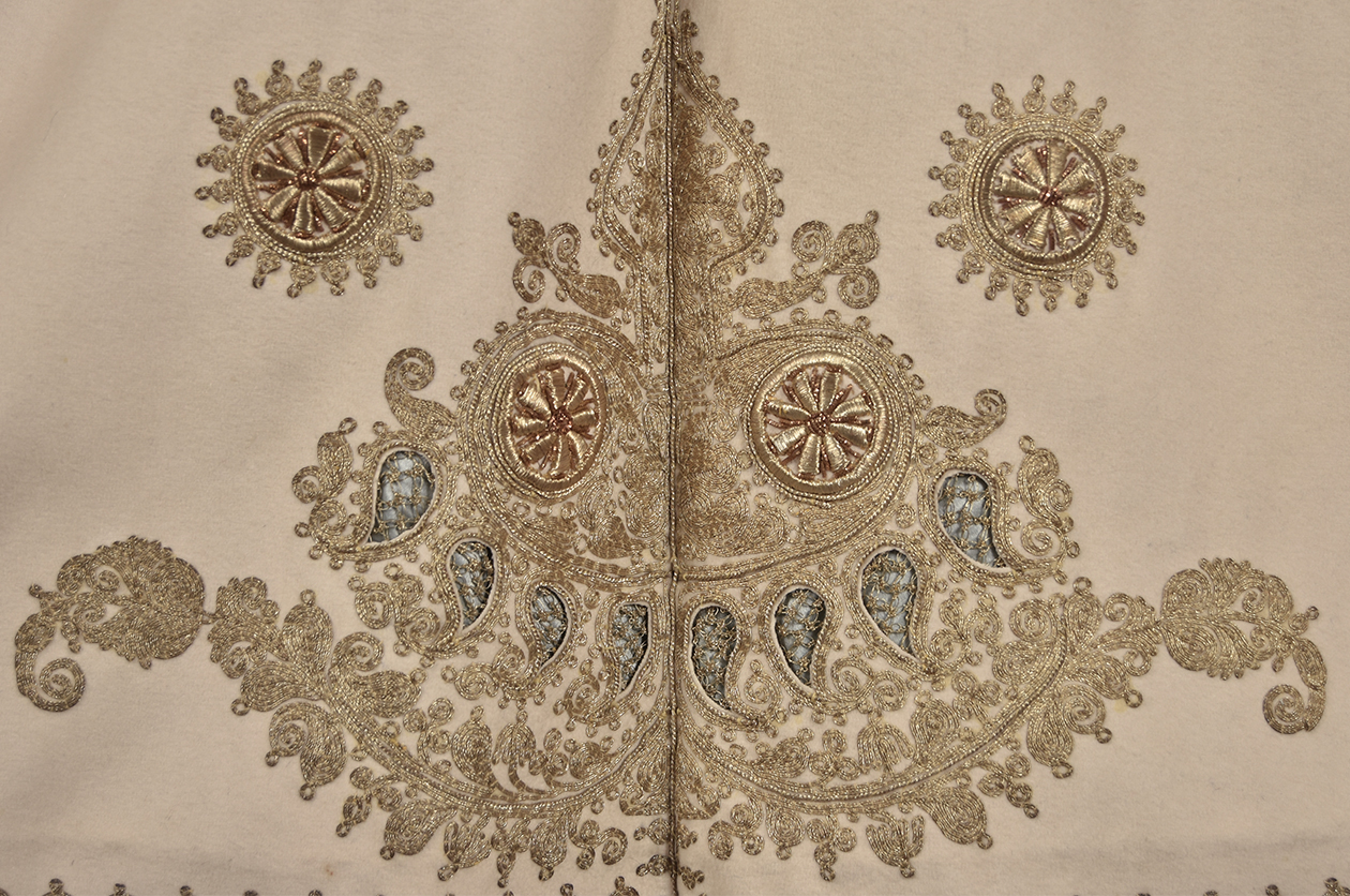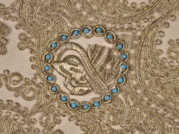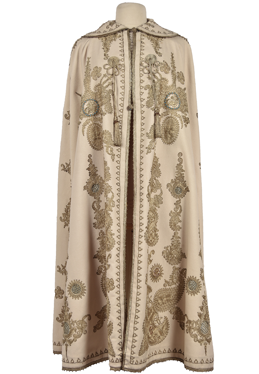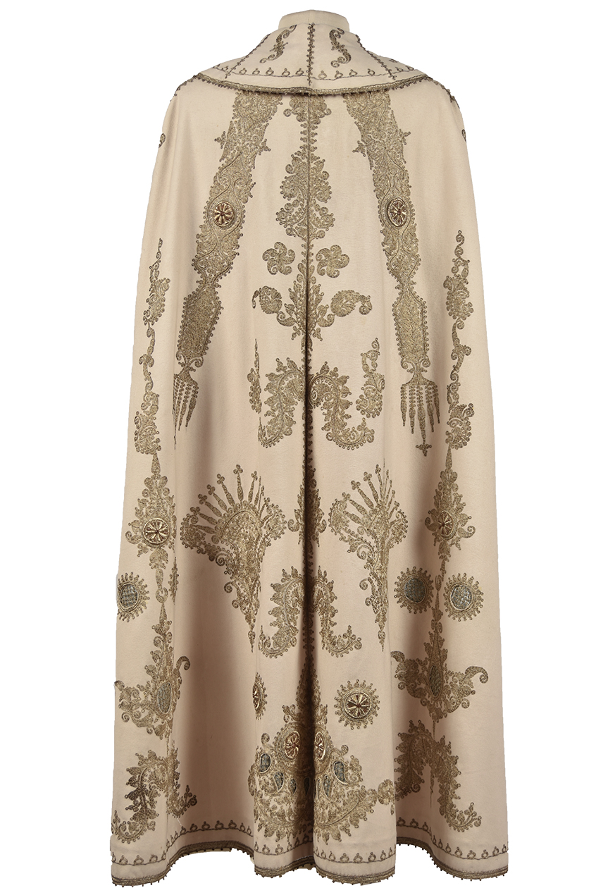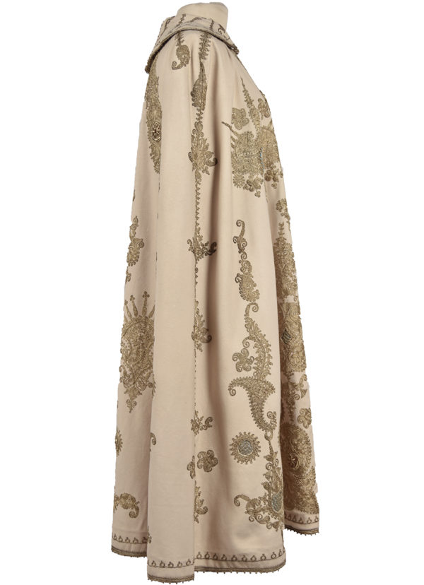 A cream color wool cape elaborately embroidered in a couched technique with gold and silver metallic thread with tiny beadwork in the details of the tassels. The only contrasting colors are turquoise beadwork and pale aqua silk in the roundel details. The cape is sewn from 4 panels of fine wool and is lined with a heavy satin silk lining. It features a full shawl collar.