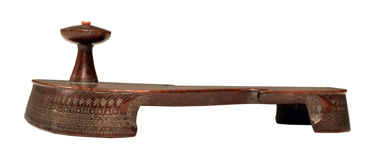 Pudukas are sandals that are comprised of wooden elevated platforms with a post placed between the big and second toe, and a knob at the post’s end to secure the foot in place. Padukas come in a variety of shapes: most notably fish, hourglass and like feet. They are often intricately carved from ivory, precious woods, or inlaid with ivory or brass wire. Padukas are often part of a either the bride’s trousseau, ritual objects of veneration, or a holy offering from the faithful.