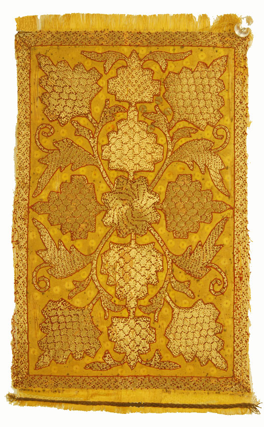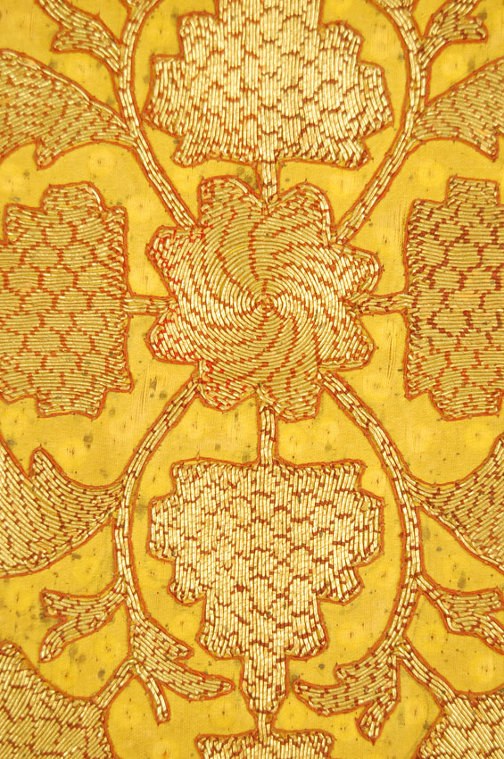 Material: Silk satin with couched metallic thread embroidery and sequins,