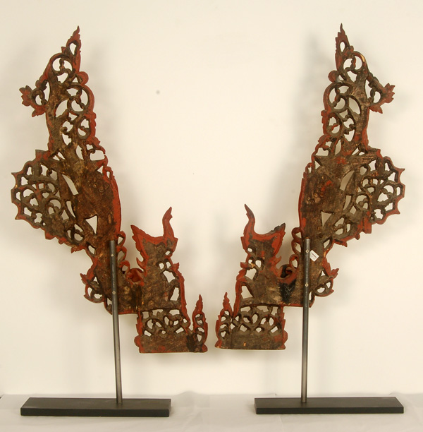 Pair of dragons in profile, carved, laquered and gilt. Originally part of an ornate interior of a Buddhist temple.